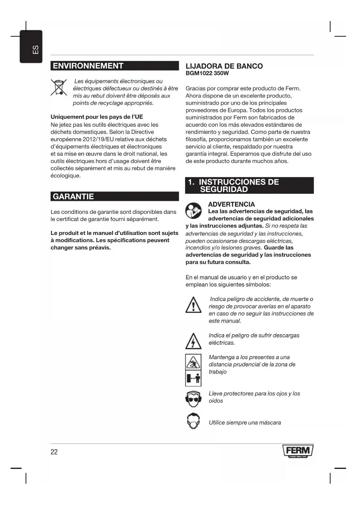 BGM1022 350W Gracias por comprar este producto de Ferm. Ahora dispone de un excelente producto, suministrado por uno de los principales proveedores de Europa. Todos los productos suministrados por Ferm son fabricados de acuerdo con los más elevados estándares de rendimiento y seguridad. Como parte de nuestra filosofía, proporcionamos también un excelente servicio al cliente, respaldado por nuestra garantía integral. Esperamos que disfrute del uso de este producto durante muchos años.