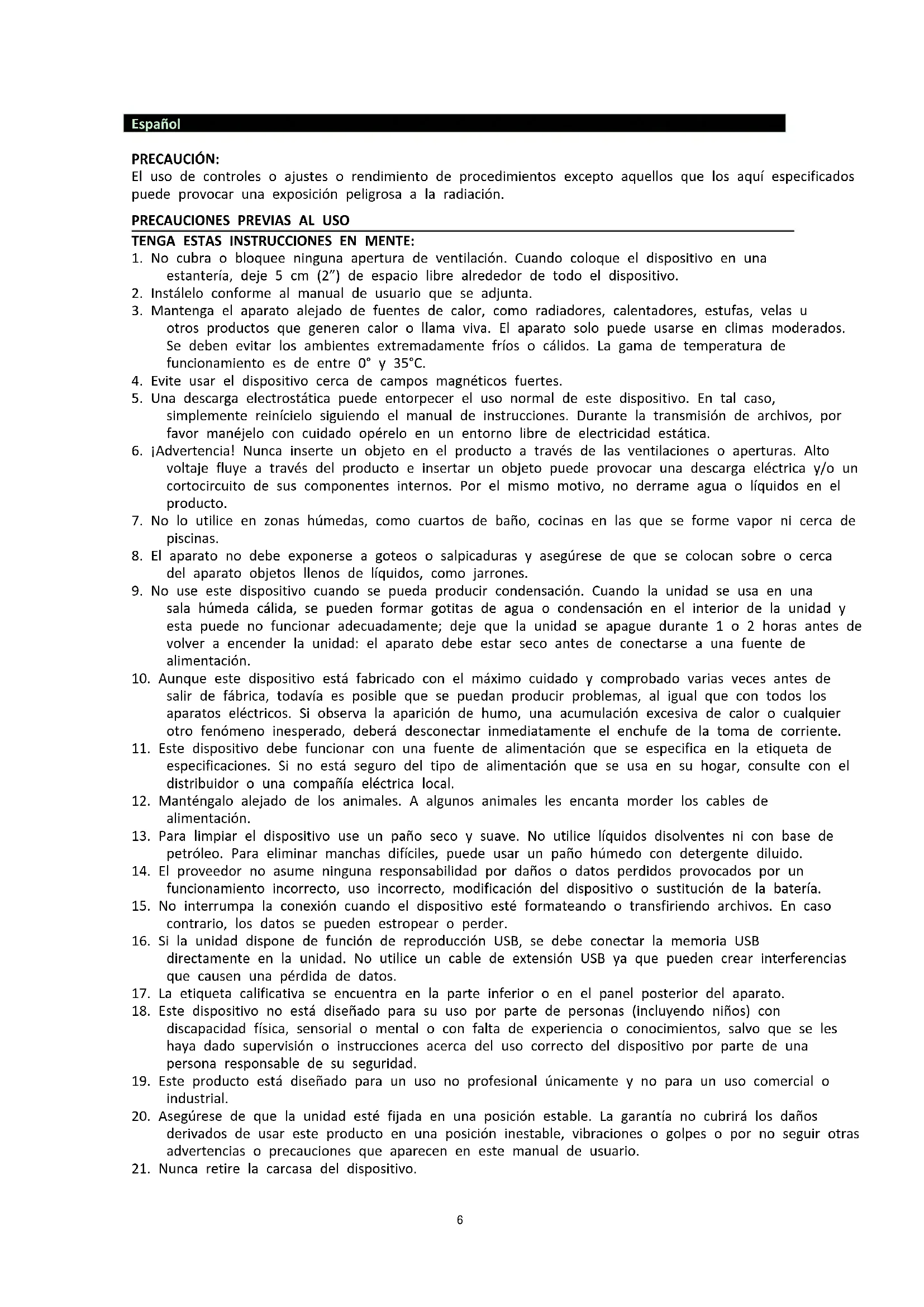 5. Una descarga electrostática puede entorpecer el uso normal de este dispositivo. En tal caso,