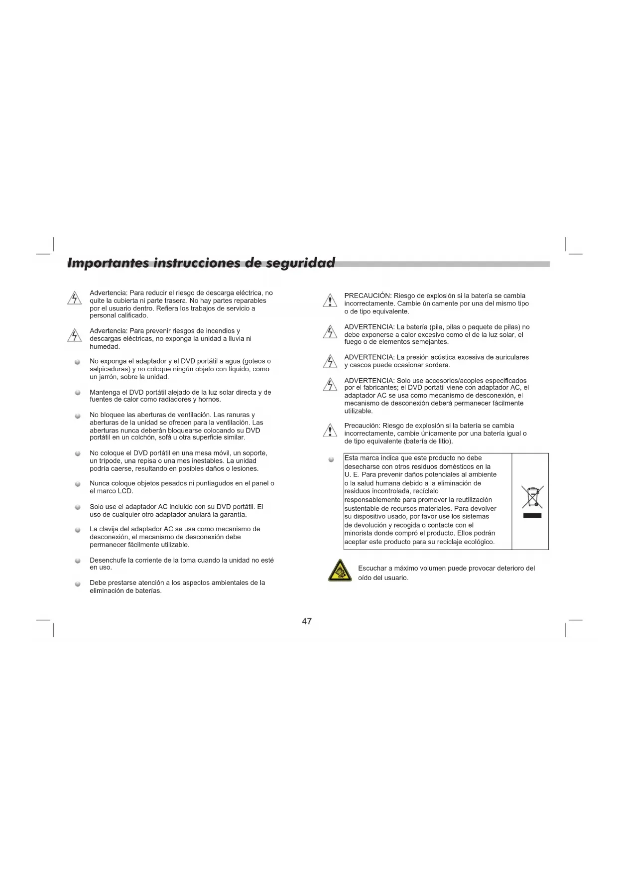 desecharse con otros residuos domésticos en la U. E. Para prevenir daños potenciales al ambiente o la salud humana debido a la eliminación de residuos incontrolada, recíclelo responsablemente para promover la reutilización sustentable de recursos materiales. Para devolver su dispositivo usado, por favor use los sistemas de devolución y recogida o contacte con el minorista donde compró el producto. Ellos podrán aceptar este producto para su reciclaje ecológico. Importantes instrucciones de seguridad PRECAUCIÓN: Riesgo de explosión si la batería se cambia incorrectamente. Cambie únicamente por una del mismo tipo o de tipo equivalente. ADVERTENCIA: La batería (pila, pilas o paquete de pilas) no debe exponerse a calor excesivo como el de la luz solar, el fuego o de elementos semejantes. ADVERTENCIA: La presión acústica excesiva de auriculares y cascos puede ocasionar sordera. ADVERTENCIA: Solo use accesorios/acoples especificados por el fabricantes; el DVD portátil viene con adaptador AC, el adaptador AC se usa como mecanismo de desconexión, el mecanismo de desconexión deberá permanecer fácilmente utilizable. Precaución: Riesgo de explosión si la batería se cambia incorrectamente, cambie únicamente por una batería igual o de tipo equivalente (batería de litio). Advertencia: Para reducir el riesgo de descarga eléctrica, no quite la cubierta ni parte trasera. No hay partes reparables por el usuario dentro. Refiera los trabajos de servicio a personal calificado. Advertencia: Para prevenir riesgos de incendios y descargas eléctricas, no exponga la unidad a lluvia ni humedad. No exponga el adaptador y el DVD portátil a agua (goteos o salpicaduras) y no coloque ningún objeto con líquido, como un jarrón, sobre la unidad. Mantenga el DVD portátil alejado de la luz solar directa y de fuentes de calor como radiadores y hornos. No bloquee las aberturas de ventilación. Las ranuras y aberturas de la unidad se ofrecen para la ventilación. Las aberturas nunca deberán bloquearse colocando su DVD portátil en un colchón, sofá u otra superficie similar. No coloque el DVD portátil en una mesa móvil, un soporte, un trípode, una repisa o una mes inestables. La unidad podría caerse, resultando en posibles daños o lesiones. Nunca coloque objetos pesados ni puntiagudos en el panel o el marco LCD. Solo use el adaptador AC incluido con su DVD portátil. El uso de cualquier otro adaptador anulará la garantía. La clavija del adaptador AC se usa como mecanismo de desconexión, el mecanismo de desconexión debe permanecer fácilmente utilizable. Desenchufe la corriente de la toma cuando la unidad no esté en uso. Debe prestarse atención a los aspectos ambientales de la eliminación de baterías. Escuchar a máximo volumen puede provocar deterioro del oído del usuario.Precauciones de seguridad