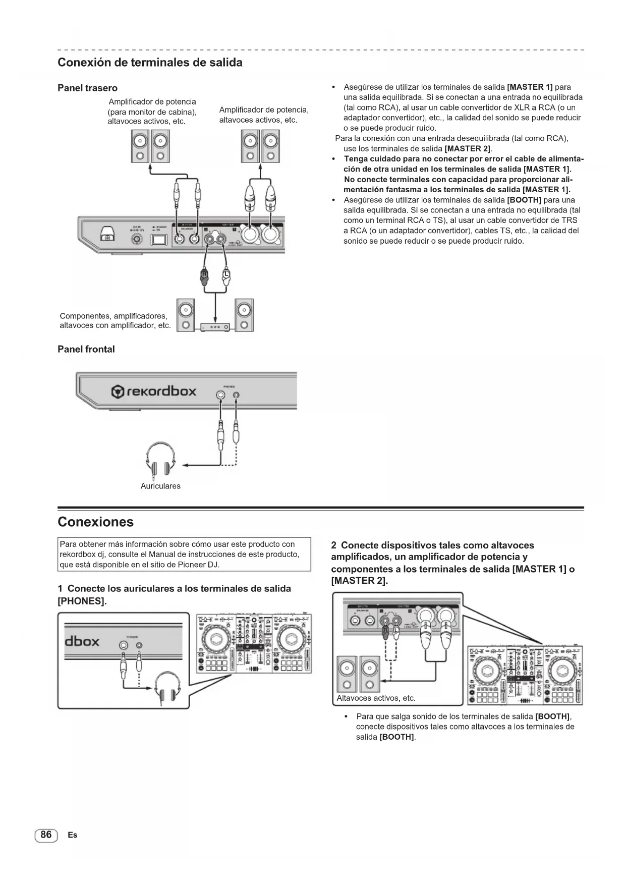 Conexión de terminales de salida Panel trasero Componentes, amplificadores, altavoces con amplificador, etc. Amplificador de potencia, altavoces activos, etc. Amplificador de potencia (para monitor de cabina), altavoces activos, etc. R L Panel frontal Auriculares ! Asegúrese de utilizar los terminales de salida [MASTER 1] para una salida equilibrada. Si se conectan a una entrada no equilibrada (tal como RCA), al usar un cable convertidor de XLR a RCA (o un adaptador convertidor), etc., la calidad del sonido se puede reducir o se puede producir ruido. Para la conexión con una entrada desequilibrada (tal como RCA), use los terminales de salida [MASTER 2]. ! Tenga cuidado para no conectar por error el cable de alimenta- ción de otra unidad en los terminales de salida [MASTER 1]. No conecte terminales con capacidad para proporcionar ali- mentación fantasma a los terminales de salida [MASTER 1]. ! Asegúrese de utilizar los terminales de salida [BOOTH] para una salida equilibrada. Si se conectan a una entrada no equilibrada (tal como un terminal RCA o TS), al usar un cable convertidor de TRS a RCA (o un adaptador convertidor), cables TS, etc., la calidad del sonido se puede reducir o se puede producir ruido. Conexiones Para obtener más información sobre cómo usar este producto con rekordbox dj, consulte el Manual de instrucciones de este producto, que está disponible en el sitio de Pioneer DJ. 1 Conecte los auriculares a los terminales de salida [PHONES]. 2 Conecte dispositivos tales como altavoces amplificados, un amplificador de potencia y componentes a los terminales de salida [MASTER 1] o [MASTER 2]. Altavoces activos, etc. ! Para que salga sonido de los terminales de salida [BOOTH], conecte dispositivos tales como altavoces a los terminales de salida [BOOTH].87 DDJ