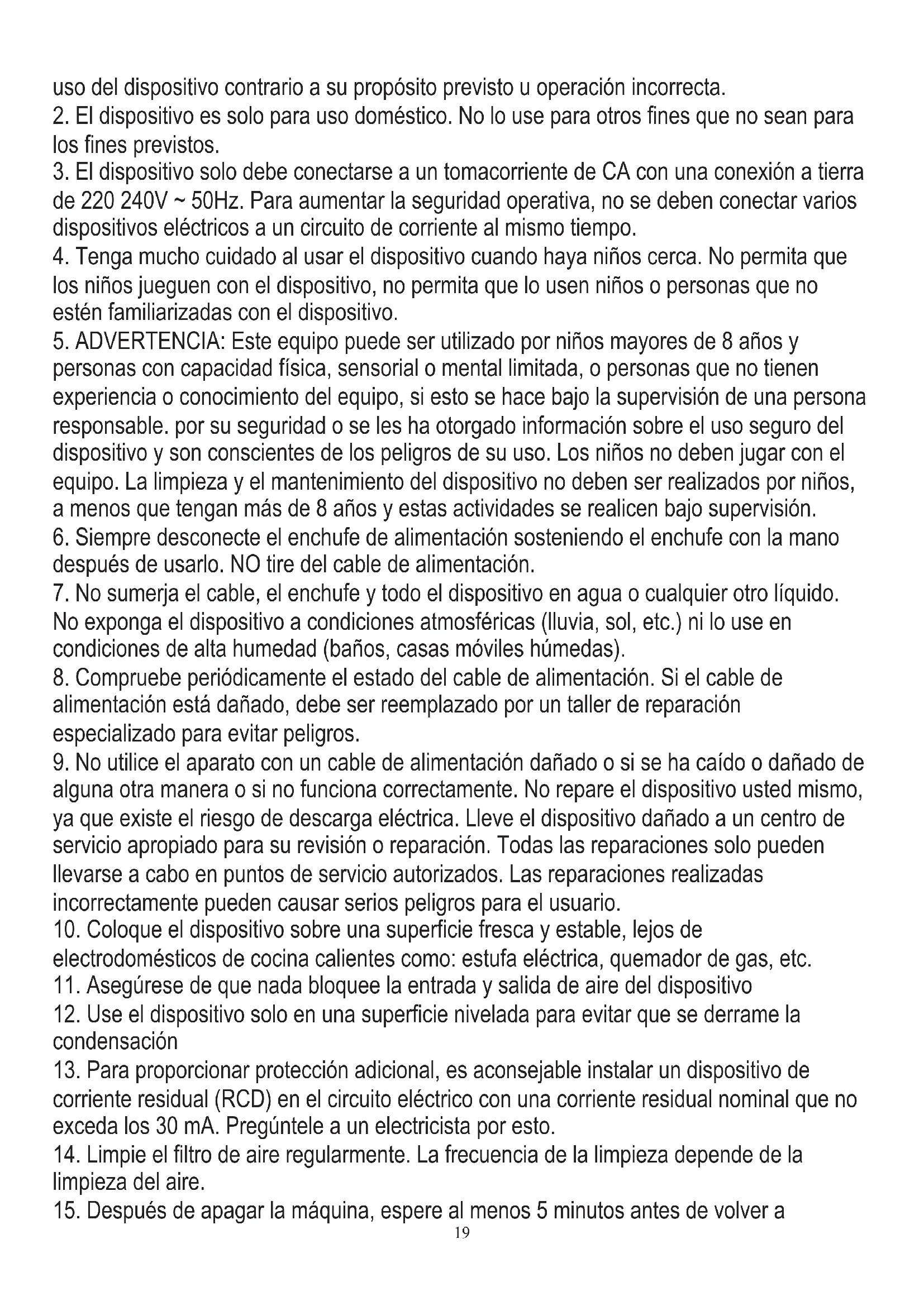 de 220 240V ~ 50Hz. Para aumentar la seguridad operativa, no se deben conectar varios dispositivos eléctricos a un circuito de corriente al mismo tiempo.