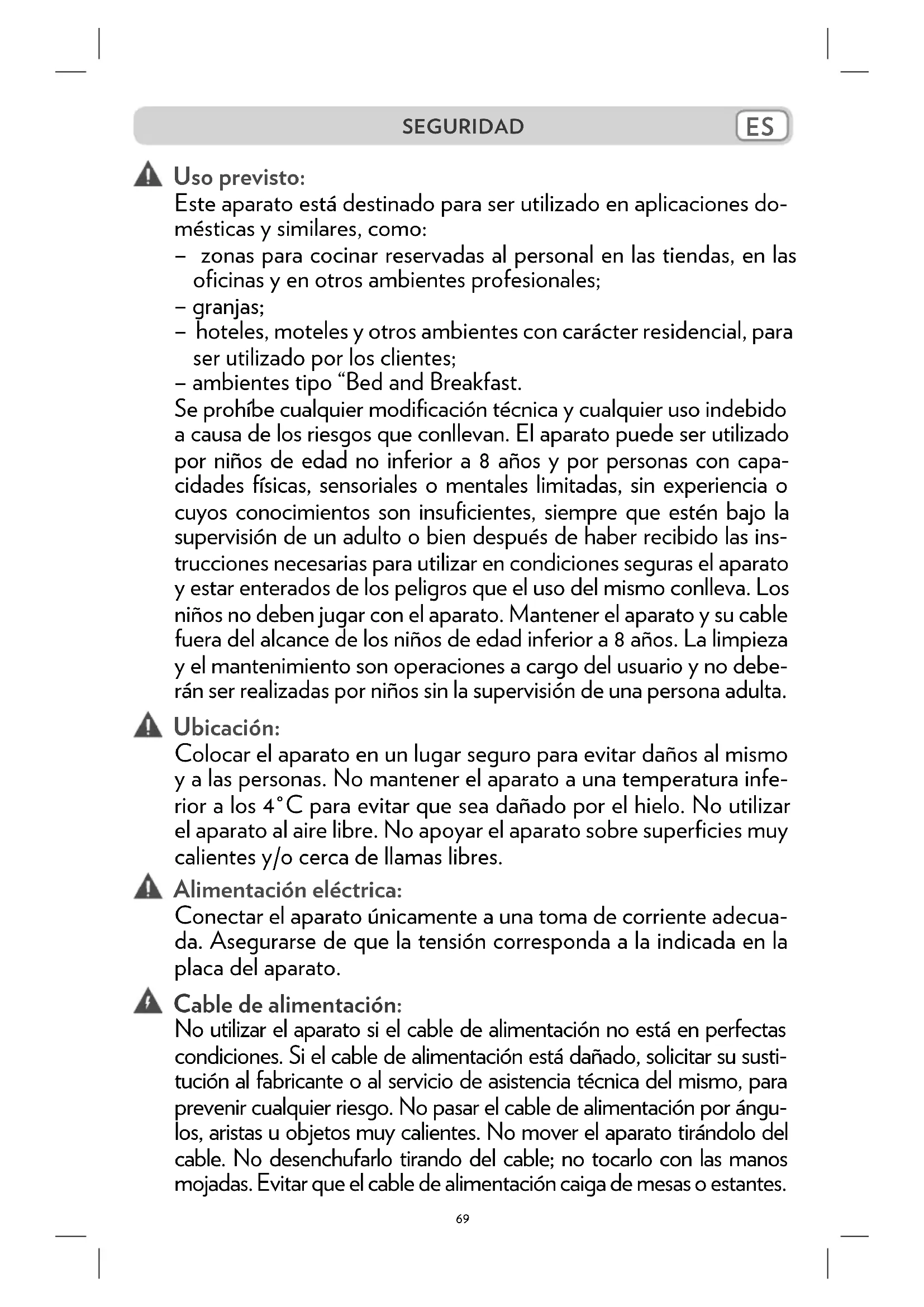 No usar el aparato si el cable de alimentación no está en perfectas conditiones. Si el cable de alimentación está danado, Solicar su sustitución al fabricante o al service de asistencia技术水平 del本身就是, parapreventir cualquier riesgo. Noatar el cable de alimentacion por ángulos, aristas u objetos muy calientes. No mover el aparato tirandolo del cable. No desenchufarlo tirando del cable; no tocarlo con las manos mojadas. Evitar que el cable de alimentacion caiga de mesas o estantes.
