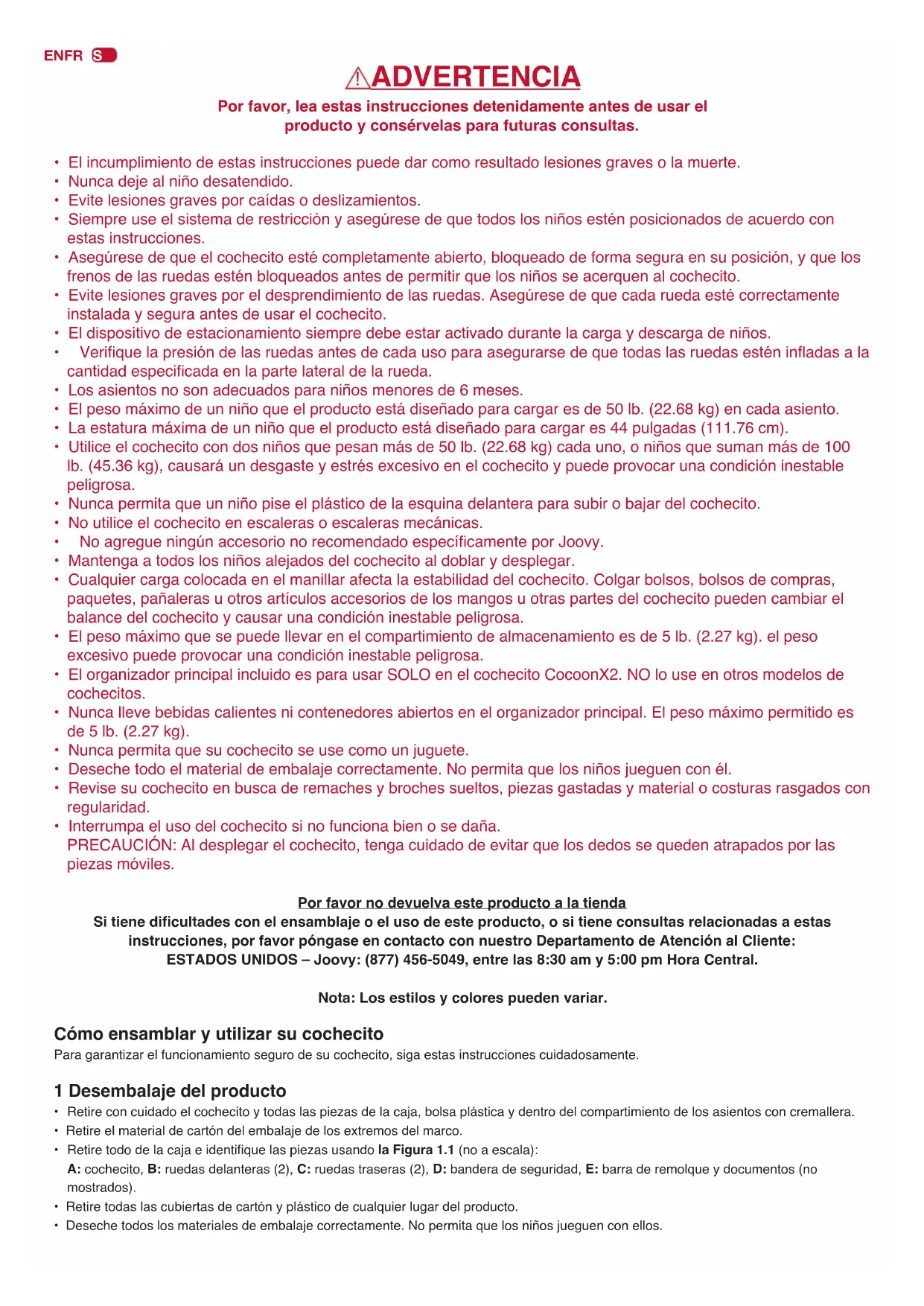 - Interrumpa el uso del cochecito si no funciona bien o se daña. PRECAUCIÓN: Al desplegar el cochecito, tenga cuidado de evitar que los dedos se queden atrapados por las piezas móviles. Por favor no devuelva este producto a la tienda Si tiene dicultades con el ensamblaje o el uso de este producto, o si tiene consultas relacionadas a estas instrucciones, por favor póngase en contacto con nuestro Departamento de Atención al Cliente: ESTADOS UNIDOS – Joovy: (877) 456-5049, entre las 8:30 am y 5:00 pm Hora Central. Nota: Los estilos y colores pueden variar. Cómo ensamblar y utilizar su cochecito Para garantizar el funcionamiento seguro de su cochecito, siga estas instrucciones cuidadosamente. 1 Desembalaje del producto