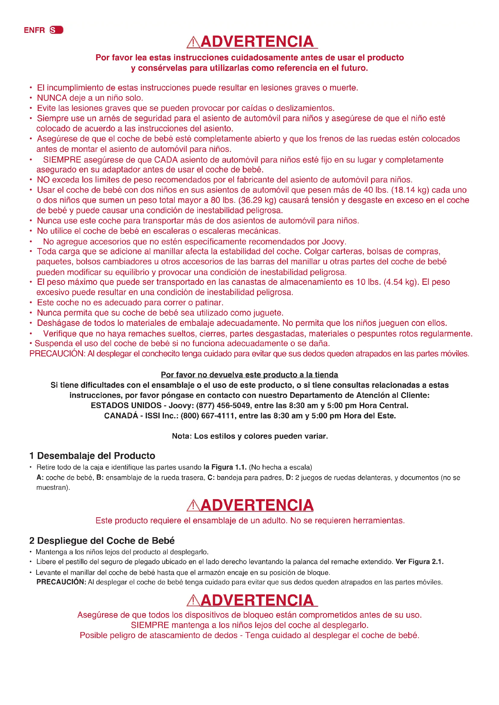 - Suspenda el uso del coche de bebé si no funciona adecuadamente o se daña. PRECAUCIÓN: Al desplegar el conchecito tenga cuidado para evitar que sus dedos queden atrapados en las partes móviles. Por favor no devuelva este producto a la tienda Si tiene dicultades con el ensamblaje o el uso de este producto, o si tiene consultas relacionadas a estas instrucciones, por favor póngase en contacto con nuestro Departamento de Atención al Cliente: ESTADOS UNIDOS - Joovy: (877) 456-5049, entre las 8:30 am y 5:00 pm Hora Central. CANADÁ - ISSI Inc.: (800) 667-4111, entre las 8:30 am y 5:00 pm Hora del Este. Nota: Los estilos y colores pueden variar. 1 Desembalaje del Producto