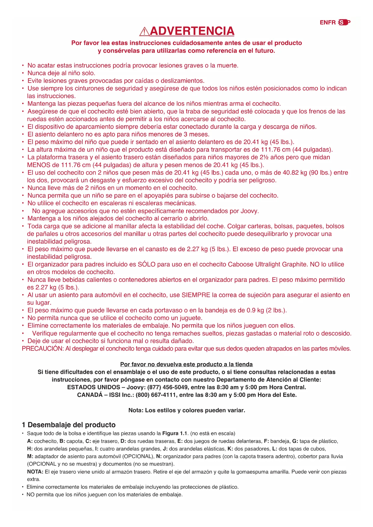 - Deje de usar el cochecito si funciona mal o resulta dañado. PRECAUCIÓN: Al desplegar el conchecito tenga cuidado para evitar que sus dedos queden atrapados en las partes móviles. Por favor no devuelva este producto a la tienda Si tiene dicultades con el ensamblaje o el uso de este producto, o si tiene consultas relacionadas a estas instrucciones, por favor póngase en contacto con nuestro Departamento de Atención al Cliente: ESTADOS UNIDOS – Joovy: (877) 456-5049, entre las 8:30 am y 5:00 pm Hora Central. CANADÁ – ISSI Inc.: (800) 667-4111, entre las 8:30 am y 5:00 pm Hora del Este. Nota: Los estilos y colores pueden variar. 1 Desembalaje del producto