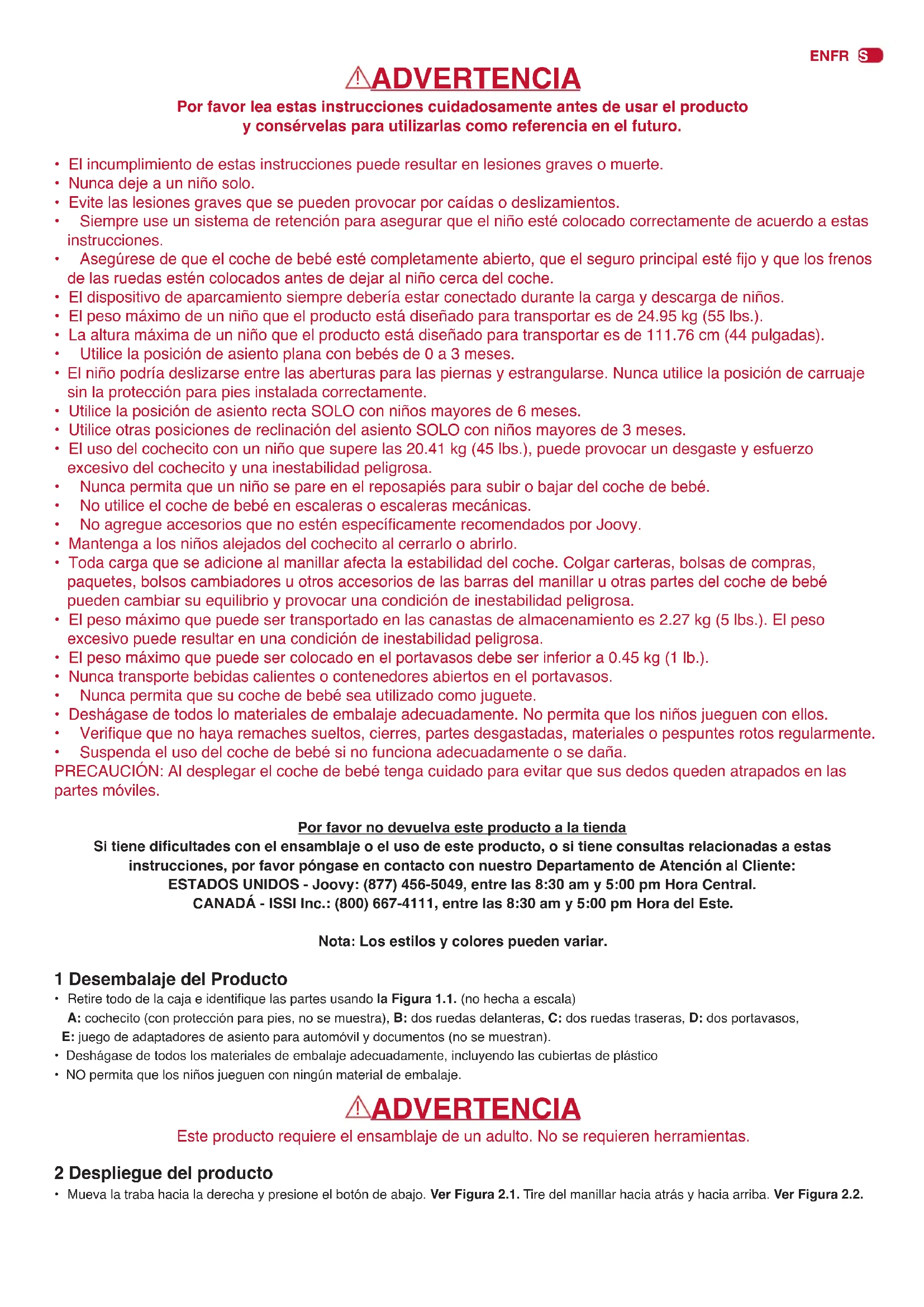 - Suspendaelusodelcochedebebésinofuncionaadecuadamenteosedaña. PRECAUCIÓN:Aldesplegarelcochedebebétengacuidadoparaevitarquesusdedosquedenatrapadosenlas partes móviles. Por favor no devuelva este producto a la tienda Si tiene dicultades con el ensamblaje o el uso de este producto, o si tiene consultas relacionadas a estas instrucciones, por favor póngase en contacto con nuestro Departamento de Atención al Cliente: ESTADOS UNIDOS - Joovy: (877) 456-5049, entre las 8:30 am y 5:00 pm Hora Central. CANADÁ - ISSI Inc.: (800) 667-4111, entre las 8:30 am y 5:00 pm Hora del Este. Nota: Los estilos y colores pueden variar. 1 Desembalaje del Producto