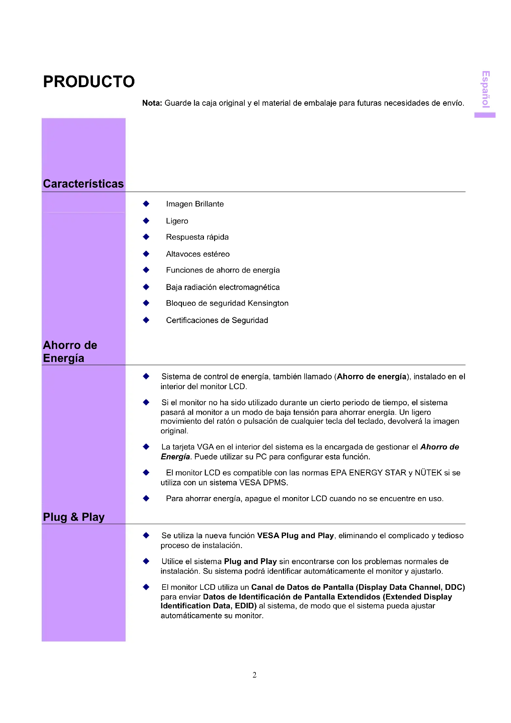 Se utiliza la nueva función VESA Plug and Play, eliminando el complicado y tedioso proceso de instalación. Utilice el sistema Plug and Play sin encontrarse con los problemas normales de instalación. Su sistema podrá identificar automáticamente el monitor y ajustarlo. El monitor LCD utiliza un Canal de Datos de Pantalla (Display Data Channel, DDC) para enviar Datos de Identificación de Pantalla Extendidos (Extended Display Identification Data, EDID) al sistema, de modo que el sistema pueda ajustar automáticamente su monitor.3 Español SEGURIDAD Nota: Tenga en cuenta las siguientes precauciones antes de usar este monitor. Eléctrica Compruebe la ensión Este producto debe funcionar con el tipo de alimentación indicada en la etiqueta. Si no está seguro del tipo de energía disponible, consulte con su distribuidor o la compañía de suministro local. Descargas Eléctricos Para evitar descargas eléctricas, este producto está equipado con un enchufe de 3 terminales y masa, que posee una tercera patilla (de masa). Este enchufe sólo entra en un enchufe de pared del tipo adecuado. Es una medida de seguridad. Si no puede insertar el enchufe en la pared, póngase en contacto con su electricista para reemplazar el enchufe obsoleto. No desheche el propósito del enchufe de masa. Para evitar descargas eléctricas, no inserte ningún objeto de metal en ninguna abertura de la carcasa del monitor LCD. No intente reparar el producto usted mismo, ni abrir o retirar cubiertas, ya que puede quedar expuesto a puntos de alta tensión y otros riesgos. Consulte las reparaciones con personal de servicio cualificado. Si el cable de alimentación está dañado, no utilice el monitor LCD. No coloque ningún objeto en el cable de alimentación, y coloque el cable alejado de zonas de mucho paso. Al tirar del enchufe del monitor LCD hacia fuera desde el enchufe de la pared, tire del enchufe, no del cable. No exponga el monitor LCD a la lluvia y no lo utilice en entornos cercanos al agua (cocinas, piscinas, etc.). Si el monitor LCD se moja, desenchufe el cable de alimentación inmediatamente y póngase en contacto con el Centro de Reparación. Condiciones Inusuales Si el monitor LCD comienza a comportarse de forma anormal, hace ruidos o emite humo u olores, desenchúfelo inmediatamente y póngase en contacto con el centro de reparación.4 Español Común Cuidados de Pantalla y Monitor Evite tocar la pantalla con los dedos u objetos rígidos. La grasa de la piel es difícil de limpiar, y si toca la pantalla con cualquier objeto puede dañar el panel. Limpie el monitor utilizando un paño suave y seco después de apagarlo. El monitor LCD no debe ser utilizado en entornos polvorientos o muy húmedos. El monitor LCD debe mantenerse alejado de fuentes de calor. Como por ejemplo: estufas, hornos, o luz solar directa. Para reducir los reflejos, no coloque el monitor en un lugar que reciba luz solar. No permita que los niños pequeños jueguen con el monitor. Si tocan con frecuencia el panel podrían quedar marcas en la pantalla y disminuir la calidad de la imagen. Manipule la pantalla con cuidado al desenchufar y mover el monitor. No coloque ningún elemento sobre el monitor LCD. Si el monitor LCD no va a ser utilizado durante un largo periodo de tiempo, desenchúfelo y colóquelo en el lugar adecuado. Utilice, si es posible, la caja original. Las aberturas del monitor LCD se utilizan como ventilación. Para evitar sobrecalentamiento, no deben bloquearse ni cubrirse las aberturas. No coloque el monitor LCD sobre una cama, un sofá, un sillón u otra superficie acolchada; ya que estos objetos pueden bloquear las ventilaciones del monitor LCD. Si coloca el monitor LCD en una estantería u otro espacio cerrado, es esencial que deje un espacio de unas 4” (10 cm) entre el monitor y cualquier superficie. Limpieza de la pantalla Asegúrese de que la zona alrededor del monitor LCD se encuentra limpia y sin humedades. Consulte la sección “Mantenimiento” para más información sobre mantenimiento.5 Español