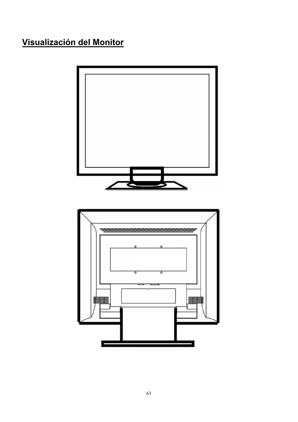 Toda información de cambio del presente manual podría ser sin preaviso alguno.63 Visualización del Monitor64 Desempacar Nuestro monitor de LCD 17”debe contener con los siguientes articulos. Hace seguro que Ud. tiene todos preparados, en caso contrario por favor contactar con su suministrador o la tienda donde Ud. hace la compra. Por ultimo, siente libre de contactar con nosotros. Monitor de LCD de 17” TFT