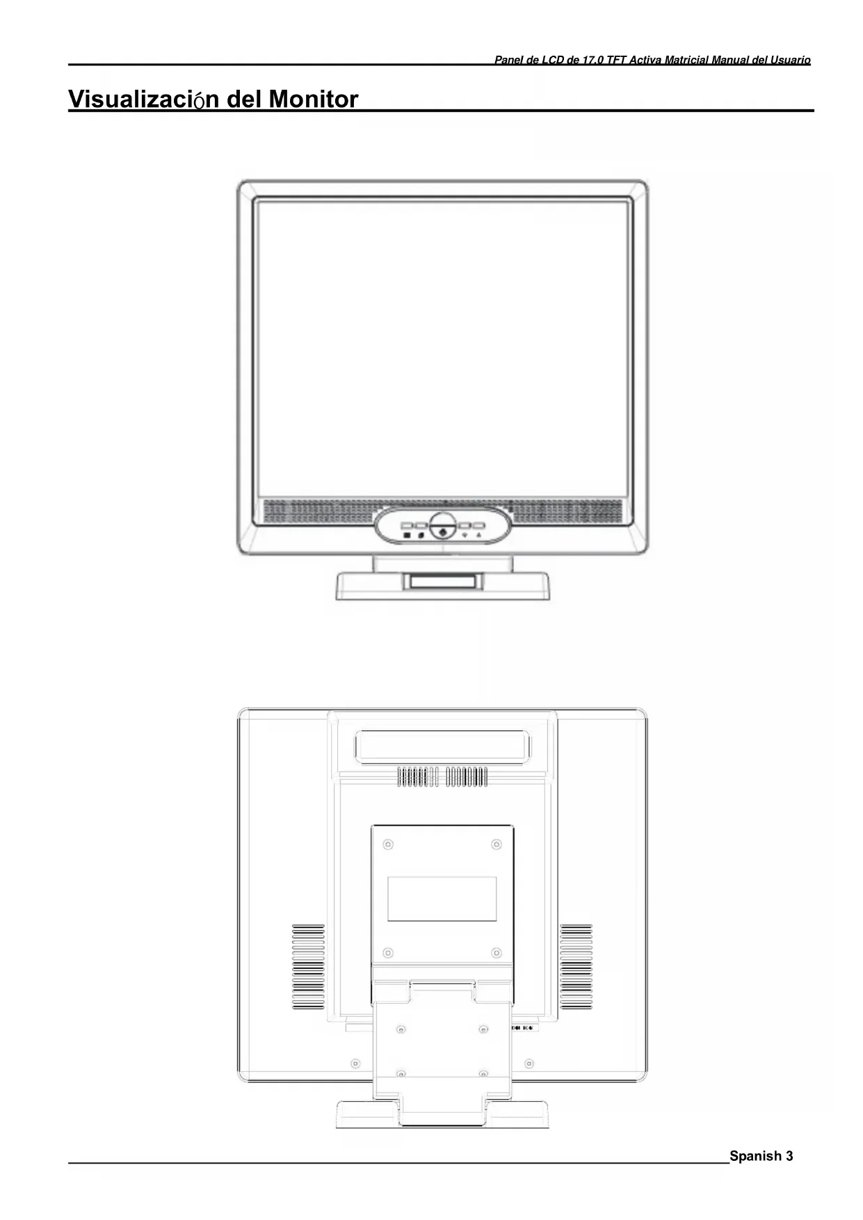 - El Texto que aparece sobre la pantalla es confuso. Revise: 1. Hace seguro que la resolución o la velocidad de refrescar corresponderá con elPanel de LCD de 17.0 TFT Activa Matricial Manual del Usuario Spanish 9 modelo de exhibición.Panel de LCD de 17.0 TFT Activa Matricial Manual del Usuario Spanish 10 OSD (Exhibición sobre la Pantalla) Menu de Modelo Selección de opción