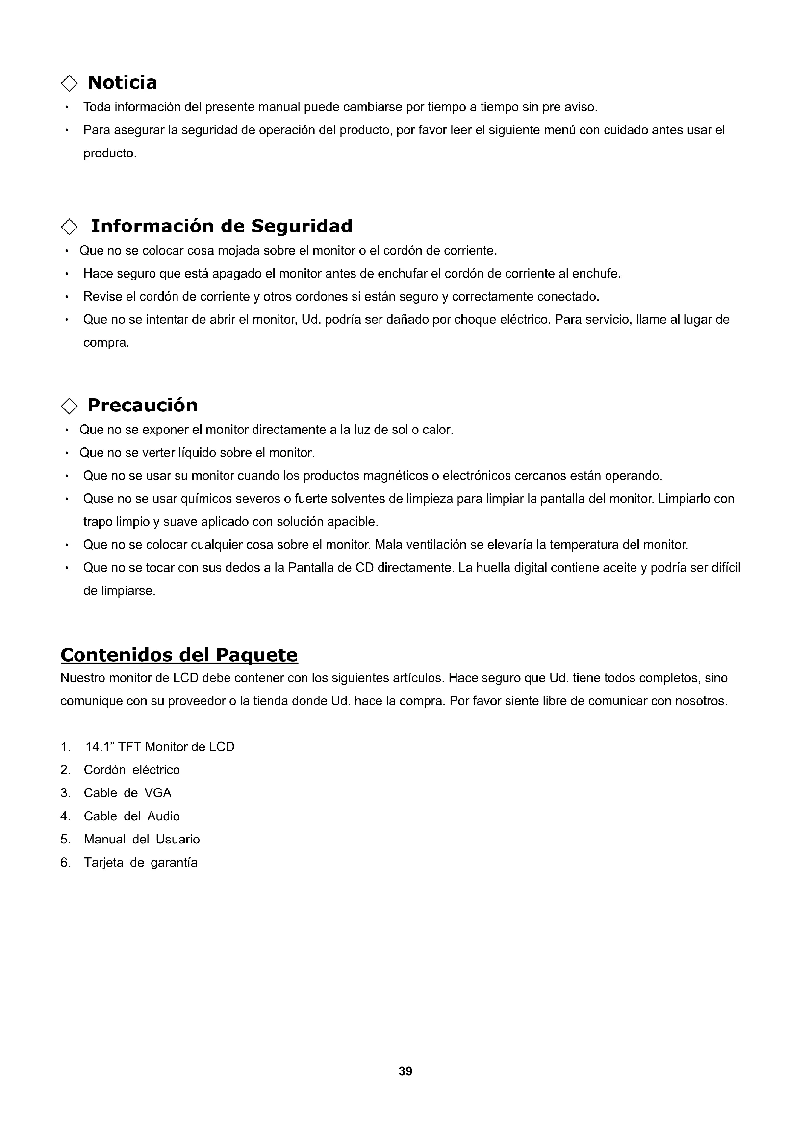 Contenidos del Paquete Nuestro monitor de LCD debe contener con los siguientes artículos. Hace seguro que Ud. tiene todos completos, sino comunique con su proveedor o la tienda donde Ud. hace la compra. Por favor siente libre de comunicar con nosotros.