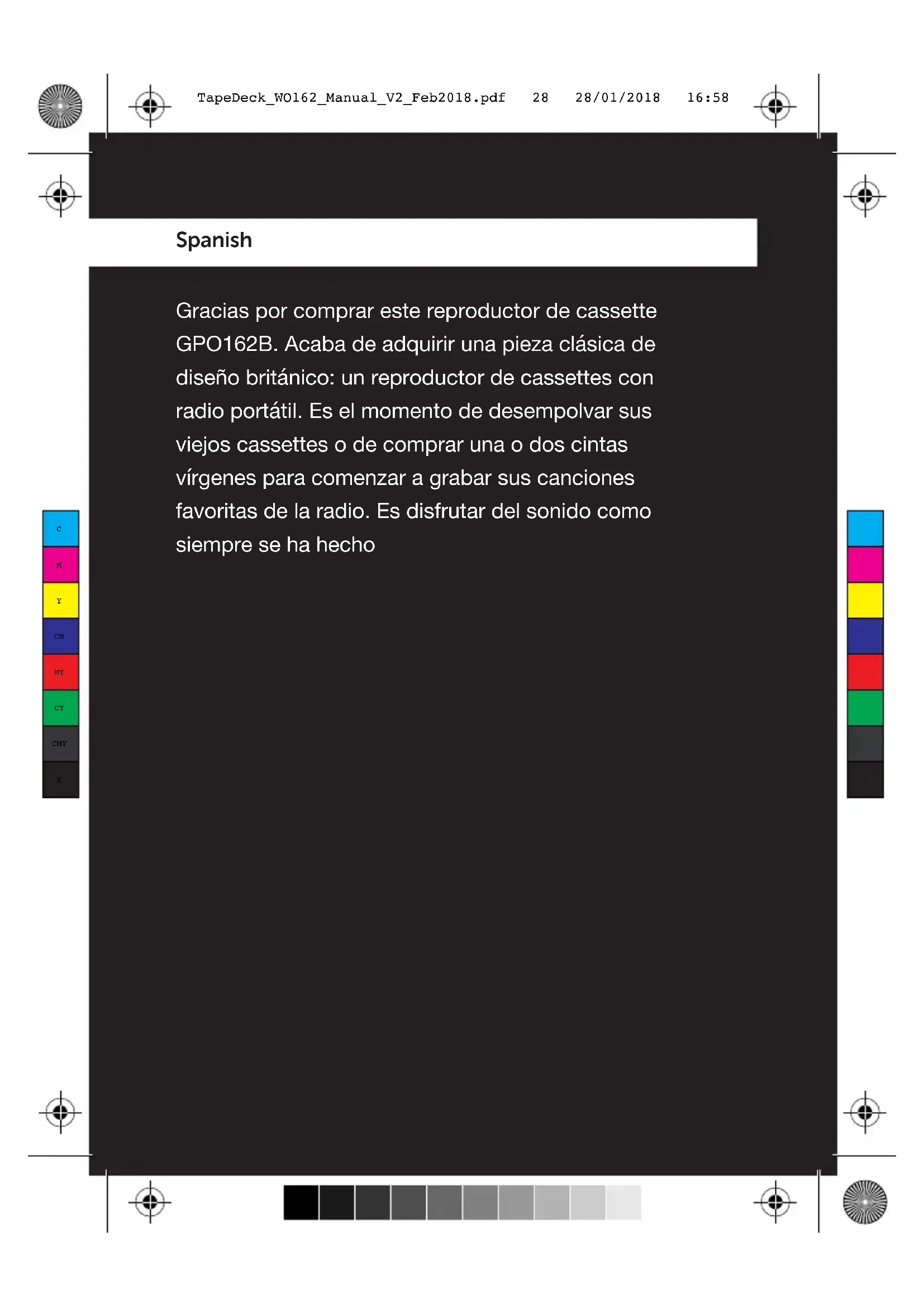 TapeDeck_WO162_Manual_V2_Feb2018.pdf 27 28/01/2018 16:58Spanish Gracias por comprar este reproductor de cassette GPO162B. Acaba de adquirir una pieza clásica de diseño británico: un reproductor de cassettes con radio portátil. Es el momento de desempolvar sus viejos cassettes o de comprar una o dos cintas vírgenes para comenzar a grabar sus canciones favoritas de la radio. Es disfrutar del sonido como siempre se ha hecho