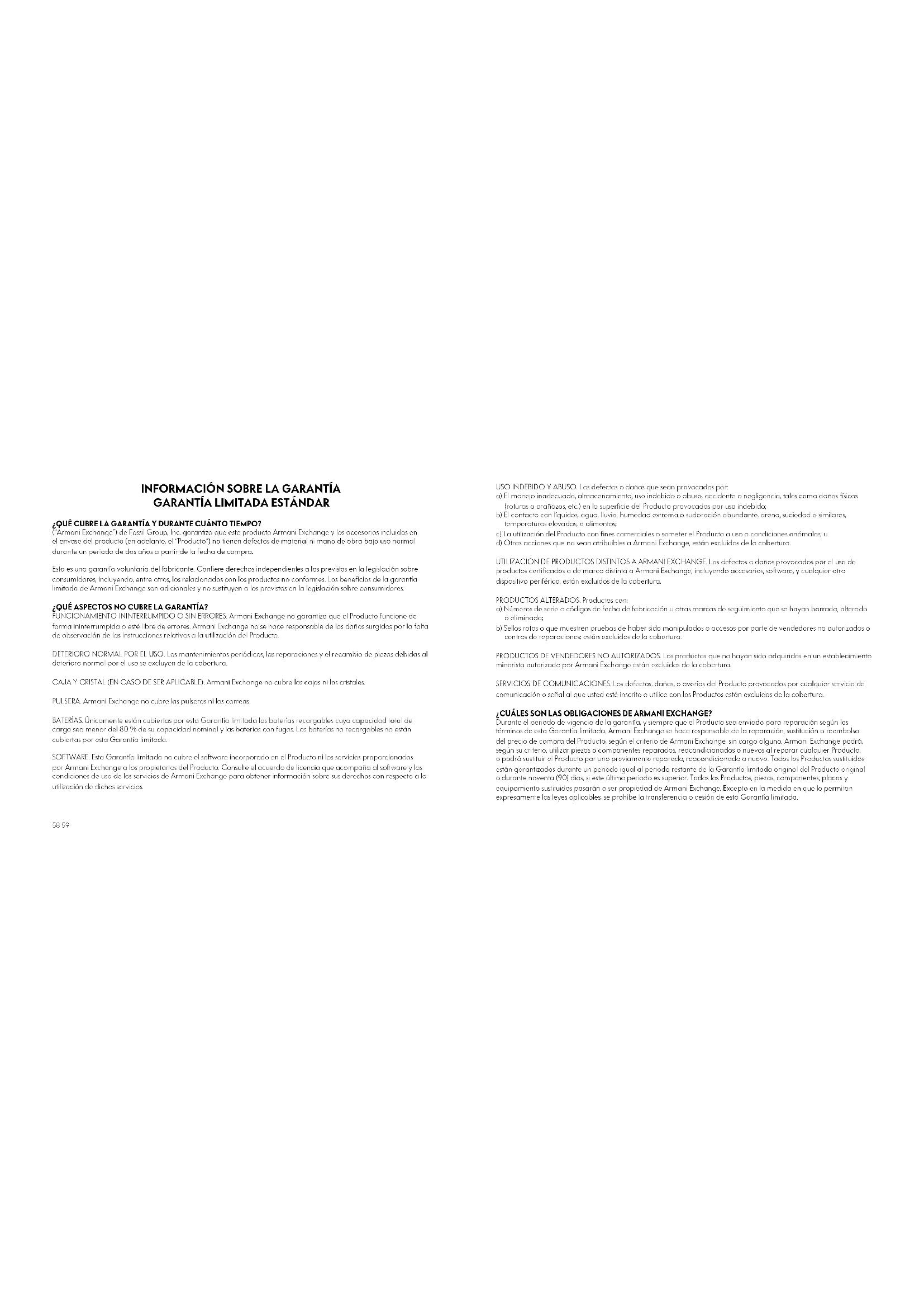 ¿QUÉ CUBRE LA GARANTÍA Y DURANTE CUÁNTO TIEMPO? (“Armani Exchange”) de Fossil Group, Inc. garantiza que este producto Armani Exchange y los accesorios incluidos en el envase del producto (en adelante, el “Producto”) no tienen defectos de material ni mano de obra bajo uso normal durante un periodo de dos años a partir de la fecha de compra. Esta es una garantía voluntaria del fabricante. Confiere derechos independientes a los previstos en la legislación sobre consumidores, incluyendo, entre otros, los relacionados con los productos no conformes. Los beneficios de la garantía limitada de Armani Exchange son adicionales y no sustituyen a los previstos en la legislación sobre consumidores. ¿QUÉ ASPECTOS NO CUBRE LA GARANTÍA? FUNCIONAMIENTO ININTERRUMPIDO O SIN ERRORES. Armani Exchange no garantiza que el Producto funcione de forma ininterrumpida o esté libre de errores. Armani Exchange no se hace responsable de los daños surgidos por la falta de observación de las instrucciones relativas a la utilización del Producto. DETERIORO NORMAL POR EL USO. Los mantenimientos periódicos, las reparaciones y el recambio de piezas debidas al deterioro normal por el uso se excluyen de la cobertura. CAJA Y CRISTAL (EN CASO DE SER APLICABLE). Armani Exchange no cubre las cajas ni los cristales. PULSERA. Armani Exchange no cubre las pulseras ni las correas. BATERÍAS. Únicamente están cubiertas por esta Garantía limitada las baterías recargables cuya capacidad total de carga sea menor del 80 % de su capacidad nominal y las baterías con fugas. Las baterías no recargables no están cubiertas por esta Garantía limitada. SOFTWARE. Esta Garantía limitada no cubre el software incorporado en el Producto ni los servicios proporcionados por Armani Exchange a los propietarios del Producto. Consulte el acuerdo de licencia que acompaña al software y las condiciones de uso de los servicios de Armani Exchange para obtener información sobre sus derechos con respecto a la utilización de dichos servicios. USO INDEBIDO Y ABUSO. Los defectos o daños que sean provocados por: a) El manejo inadecuado, almacenamiento, uso indebido o abuso, accidente o negligencia, tales como daños físicos (roturas o arañazos, etc.) en la superficie del Producto provocadas por uso indebido; b) El contacto con líquidos, agua, lluvia, humedad extrema o sudoración abundante, arena, suciedad o similares, temperaturas elevadas, o alimentos; c) La utilización del Producto con fines comerciales o someter el Producto a uso o condiciones anómalas; u d) Otras acciones que no sean atribuibles a Armani Exchange, están excluidos de la cobertura. UTILIZACIÓN DE PRODUCTOS DISTINTOS A ARMANI EXCHANGE. Los defectos o daños provocados por el uso de productos certificados o de marca distinta a Armani Exchange, incluyendo accesorios, software, y cualquier otro dispositivo periférico, están excluidos de la cobertura. PRODUCTOS ALTERADOS. Productos con: a) Números de serie o códigos de fecha de fabricación u otras marcas de seguimiento que se hayan borrado, alterado o eliminado; b) Sellos rotos o que muestren pruebas de haber sido manipulados o accesos por parte de vendedores no autorizados o centros de reparaciones; están excluidos de la cobertura. PRODUCTOS DE VENDEDORES NO AUTORIZADOS. Los productos que no hayan sido adquiridos en un establecimiento minorista autorizado por Armani Exchange están excluidos de la cobertura. SERVICIOS DE COMUNICACIONES. Los defectos, daños, o averías del Producto provocados por cualquier servicio de comunicación o señal al que usted esté inscrito o utilice con los Productos están excluidos de la cobertura. ¿CUÁLES SON LAS OBLIGACIONES DE ARMANI EXCHANGE? Durante el periodo de vigencia de la garantía, y siempre que el Producto sea enviado para reparación según los términos de esta Garantía limitada, Armani Exchange se hace responsable de la reparación, sustitución o reembolso del precio de compra del Producto, según el criterio de Armani Exchange, sin cargo alguno. Armani Exchange podrá, según su criterio, utilizar piezas o componentes reparados, reacondicionados o nuevos al reparar cualquier Producto, o podrá sustituir el Producto por uno previamente reparado, reacondicionado o nuevo. Todos los Productos sustituidos están garantizados durante un periodo igual al periodo restante de la Garantía limitada original del Producto original o durante noventa (90) días, si este último período es superior. Todos los Productos, piezas, componentes, placas y equipamiento sustituidos pasarán a ser propiedad de Armani Exchange. Excepto en la medida en que lo permitan expresamente las leyes aplicables, se prohíbe la transferencia o cesión de esta Garantía limitada.60 61 ¿QUÉ DEBE HACER PARA OBTENER EL SERVICIO DE GARANTÍA? Para obtener el servicio según los términos de esta Garantía limitada, debe devolver el Producto a un centro de servicio autorizado, empaquetado correctamente para su envío, acompañado de la factura de compra o prueba equivalente de compra que muestre la fecha original en que se adquirió, el número de serie del Producto y el nombre y dirección del vendedor. En caso de que Armani Exchange determine que el Producto no está cubierto por esta Garantía limitada, deberá pagar todas las piezas, gastos de envío y gastos de mano de obra para la reparación o devolución de dicho Producto. Para encontrar el centro de asistencia internacional autorizado más cercano, visite www.axconnected.com No se volverán a instalar datos, software o aplicaciones que se hayan añadido al Producto. Debe conservar una copia de seguridad de los contenidos del Producto antes de entregar el Producto a Armani Exchange para el servicio de garantía, ya que parte o la totalidad de dichos contenidos pueden ser borrados o reformateados durante el servicio de la garantía. ¿CUÁLES SON LOS LÍMITES DE RESPONSABILIDAD DE ARMANI EXCHANGE? LAS GARANTÍAS Y COMPENSACIONES ANT