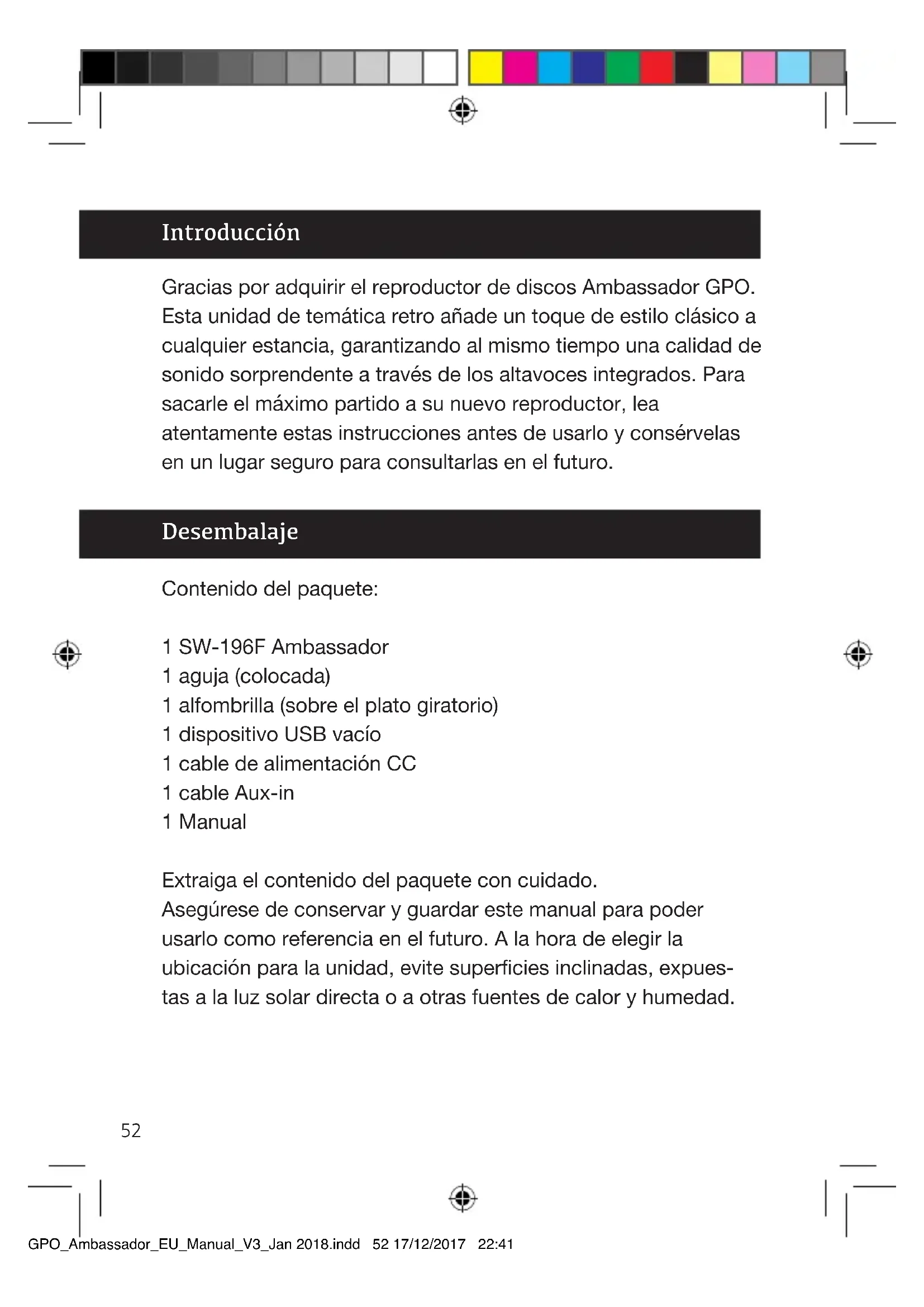 GPO_Ambassador_EU_Manual_V3_Jan 2018.indd 51 17/12/2017 22:4152 Introducción Gracias por adquirir el reproductor de discos Ambassador GPO. Esta unidad de temática retro añade un toque de estilo clásico a cualquier estancia, garantizando al mismo tiempo una calidad de sonido sorprendente a través de los altavoces integrados. Para sacarle el máximo partido a su nuevo reproductor, lea atentamente estas instrucciones antes de usarlo y consérvelas en un lugar seguro para consultarlas en el futuro. Contenido del paquete: 1 SW-196F Ambassador 1 aguja (colocada) 1 alfombrilla (sobre el plato giratorio) 1 dispositivo USB vacío 1 cable de alimentación CC 1 cable Aux-in 1 Manual Extraiga el contenido del paquete con cuidado. Asegúrese de conservar y guardar este manual para poder usarlo como referencia en el futuro. A la hora de elegir la ubicación para la unidad, evite superficies inclinadas, expues- tas a la luz solar directa o a otras fuentes de calor y humedad. Desembalaje GPO_Ambassador_EU_Manual_V3_Jan 2018.indd 52 17/12/2017 22:4153 Funciones Su equipo Ambassador incluye las siguientes funciones: 1.Tocadiscos de 3 velocidades (33, 45 o 78 RPM) 2.Transmisión por correa y brazo de accionamiento automático