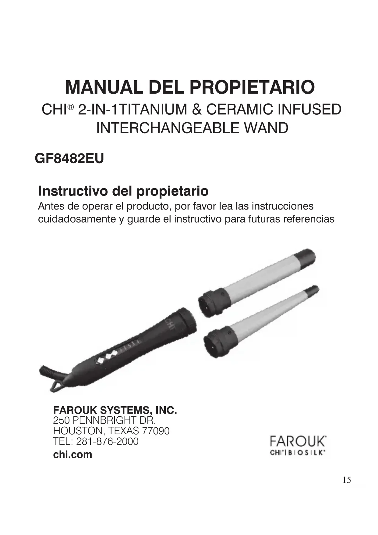 B. Contacte al département de servicios al cliente de Farouk Systems, Inc. para cualquier pregunta referente a su herramipta. Para envios, mande su herramipta jusqu con la tarjeta de garantia que acosmañana a la herramipta al tiempo de la compra, el recibo original que indica la location y fecha de su compra, y un cheque o "money order" expedido a favor de Farouk Systems, Inc. a la siguientes direccion por la cantidad de $15.00 dóares para cubrir costos de envio y manejo (En EE.UU. solamente: Los residentes de California no necesitan enviar pago).