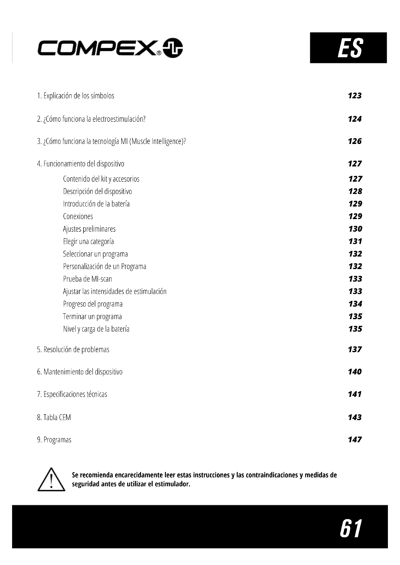 Contenido del kit y accesorios 127 Descripción del dispositivo 128 Introducción de la batería 129 Conexiones 129 Ajustes preliminares 130 Elegir una categoría 131 Seleccionar un programa 132 Personalización de un Programa 132 Prueba de MI-scan 133 Ajustar las intensidades de estimulación 133 Progreso del programa 134 Terminar un programa 135 Nivel y carga de la batería 135