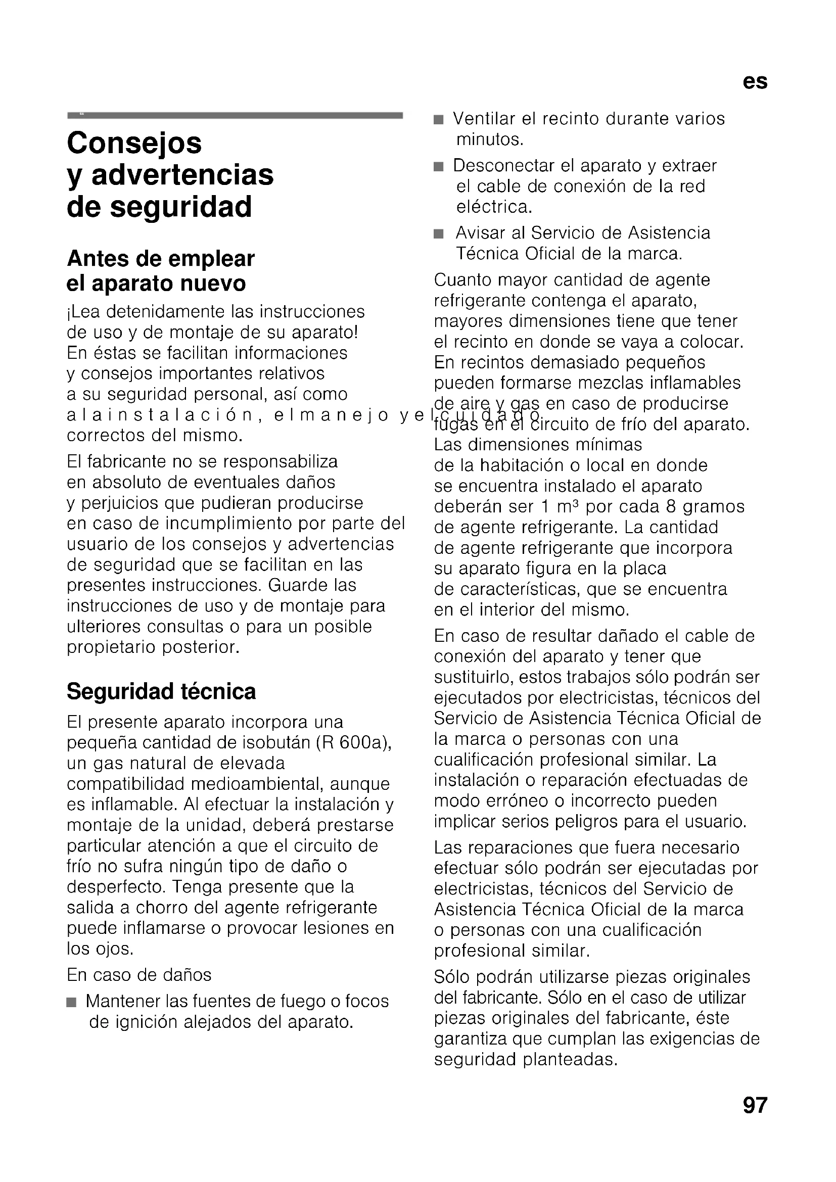 esÍndi ce esInstrucciones de uso Consejos y advertencias de seguridad Antes de emplear el aparato nuevo ¡Lea detenidamente las instrucciones de uso y de montaje de su aparato! En éstas se facilitan informaciones y consejos importantes relativos a su seguridad personal, así como alainstalación, elmanejo yelcuidado correctos del mismo. El fabricante no se responsabiliza en absoluto de eventuales daños y perjuicios que pudieran producirse en caso de incumplimiento por parte del usuario de los consejos y advertencias de seguridad que se facilitan en las presentes instrucciones. Guarde las instrucciones de uso y de montaje para ulteriores consultas o para un posible propietario posterior. Seguridad técnica El presente aparato incorpora una pequeña cantidad de isobután (R 600a), un gas natural de elevada compatibilidad medioambiental, aunque es inflamable. Al efectuar la instalación y montaje de la unidad, deberá prestarse particular atención a que el circuito de frío no sufra ningún tipo de daño o desperfecto. Tenga presente que la salida a chorro del agente refrigerante puede inflamarse o provocar lesiones en los ojos. En caso de daños ■ Mantener las fuentes de fuego o focos de ignición alejados del aparato. ■ Ventilar el recinto durante varios minutos. ■ Desconectar el aparato y extraer el cable de conexión de la red eléctrica. ■ Avisar al Servicio de Asistencia Técnica Oficial de la marca. Cuanto mayor cantidad de agente refrigerante contenga el aparato, mayores dimensiones tiene que tener el recinto en donde se vaya a colocar. En recintos demasiado pequeños pueden formarse mezclas inflamables de aire y gas en caso de producirse fugas en el circuito de frío del aparato. Las dimensiones mínimas de la habitación o local en donde se encuentra instalado el aparato deberán ser 1 m³ por cada 8 gramos de agente refrigerante. La cantidad de agente refrigerante que incorpora su aparato figura en la placa de características, que se encuentra en el interior del mismo. En caso de resultar dañado el cable de conexión del aparato y tener que sustituirlo, estos trabajos sólo podrán ser ejecutados por electricistas, técnicos del Servicio de Asistencia Técnica Oficial de la marca o personas con una cualificación profesional similar. La instalación o reparación efectuadas de modo erróneo o incorrecto pueden implicar serios peligros para el usuario. Las reparaciones que fuera necesario efectuar sólo podrán ser ejecutadas por electricistas, técnicos del Servicio de Asistencia Técnica Oficial de la marca o personas con una cualificación profesional similar. Sólo podrán utilizarse piezas originales del fabricante. Sólo en el caso de utilizar piezas originales del fabricante, éste garantiza que cumplan las exigencias de seguridad planteadas.es