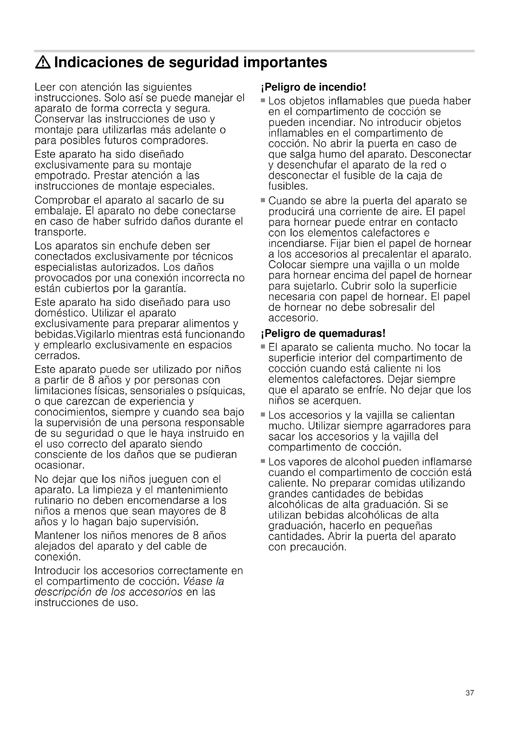 Los vapores de alcohol pueden inflamarse cuando el compartimento de cocción está caliente. No preparar comidas utilizando grandes cantidades de bebidas alcohólicas de alta graduación. Si se utilizan bebidas alcohólicas de alta graduación, hacerlo en pequeñas cantidades. Abrir la puerta del aparato con precaución.38 ¡Peligro de quemaduras!