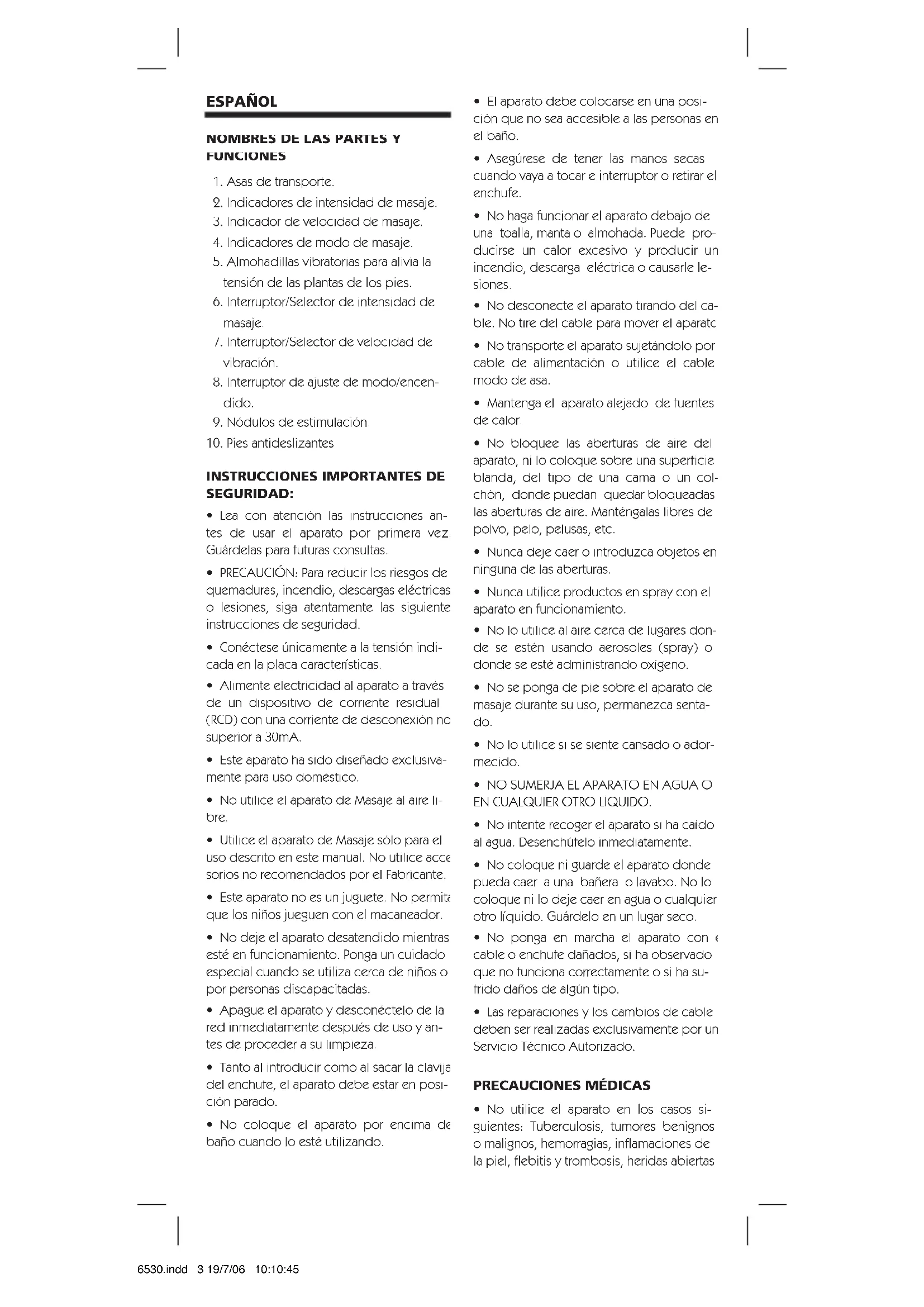 - No utilice el aparato en los casos si- guientes: Tuberculosis, tumores benignos o malignos, hemorragias, inflamaciones de la piel, flebitis y trombosis, heridas abiertas MJ6530.indd 3 19/7/06 10:10:45y recientes, contusiones, piel rota o venas varicosas, o dolor sin origen determinado en las pantorrillas.