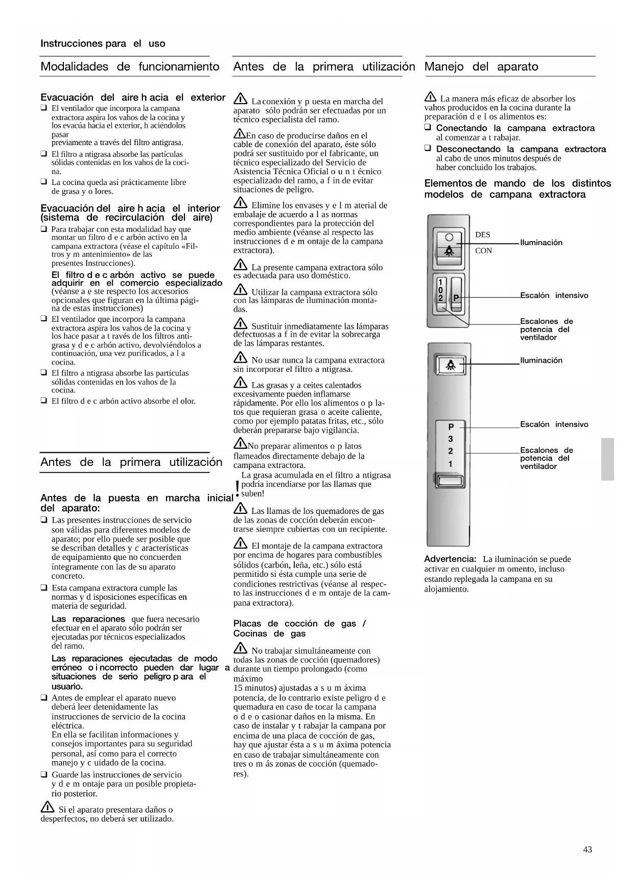 La cocina queda así prácticamente librede grasa yolores. Evacuación del airehacia el interior (sistema de recirculación del aire) ❑ Para trabajar con esta modalidad hay quemontar un filtrodecarbón activo en lacampana extractora (véase el capítulo «Fil-tros ymantenimiento» de laspresentes Instrucciones).El filtrodecarbón activo se puedeadquirir en el comercio especializado(véanse aeste respecto los accesoriosopcionales que figuran en la última pági-na de estas instrucciones) El ventilador que incorpora la campanaextractora aspira los vahos de la cocina ylos hace pasar através de los filtros anti-grasa ydecarbón activo, devolviéndolos acontinuación, una vez purificados, alacocina. El filtroantigrasa absorbe las partículassólidas contenidas en los vahos de lacocina. El filtrodecarbón activo absorbe el olor. Modalidades de funcionamiento Instrucciones para el uso Antes de la puesta en marcha inicial del aparato: ❑ Las presentes instrucciones de servicioson válidas para diferentes modelos deaparato; por ello puede ser posible quese describan detalles ycaracterísticasde equipamiento que no concuerdeníntegramente con las de su aparatoconcreto.❑ Esta campana extractora cumple lasnormas ydisposiciones específicas enmateria de seguridad.Las reparaciones que fuera necesarioefectuar en el aparato sólo podrán serejecutadas por técnicos especializadosdel ramo.Las reparaciones ejecutadas de modoerróneo oincorrecto pueden dar lugar asituaciones de serio peligropara elusuario.❑ Antes de emplear el aparato nuevodeberá leer detenidamente lasinstrucciones de servicio de la cocinaeléctrica.En ella se facilitan informaciones yconsejos importantes para su seguridadpersonal, así como para el correctomanejo ycuidado de la cocina.❑ Guarde las instrucciones de servicioydemontaje para un posible propieta-rio posterior. Si el aparato presentara daños o desperfectos, no deberá ser utilizado. conexión ypuesta en marcha delaparatosólo podrán ser efectuadas por untécnico especialista del ramo. En caso de producirse daños en el cable de conexión del aparato, éste sólopodrá ser sustituido por el fabricante, untécnico especializado del Servicio deAsistencia Técnica Oficial ountécnicoespecializado del ramo, afin de evitarsituaciones de peligro. Elimine los envases yelmaterial de embalaje de acuerdo alas normascorrespondientes para la protección delmedio ambiente (véanse al respecto lasinstruccionesdemontaje de la campanaextractora). La presente campana extractora sólo es adecuada para uso doméstico. Utilizar la campana extractora sólo con las lámparas de iluminación monta- das. Sustituir inmediatamente las lámparas defectuosas afin de evitar la sobrecargade las lámparas restantes. No usar nunca la campana extractora sin incorporar el filtroantigrasa. Las grasas yaceites calentados excesivamente pueden inflamarserápidamente. Por ello los alimentos opla- tos que requieran grasa oaceite caliente, como por ejemplo patatas fritas, etc., sólodeberán prepararse bajo vigilancia. No preparar alimentos oplatos flameados directamente debajo de lacampana extractora.La grasa acumulada en el filtroantigrasapodría incendiarse por las llamas que !suben! Las llamas de los quemadores de gas de las zonas de cocción deberán encon- trarse siemprecubiertas con un recipiente. El montaje de la campana extractora por encima de hogares para combustiblessólidos (carbón, leña, etc.) sólo estápermitido si ésta cumple una serie de condiciones restrictivas (véanse al respec- to las instruccionesdemontaje de la cam-pana extractora).Placas de cocción de gas /Cocinas de gas No trabajar simultáneamente con todas las zonas de cocción (quemadores)durante un tiempo prolongado (comomáximo15 minutos) ajustadas asumáximapotencia, de lo contrario existe peligrodequemadura en caso de tocar la campanaodeocasionar daños en la misma. Encaso de instalar ytrabajar la campana porencima de una placa de cocción de gas,hay que ajustar ésta asumáxima potenciaen caso de trabajar simultáneamente contres omás zonas de cocción (quemado-res). Antes de la primera utilización Antes de la primera utilización La manera más eficaz de absorber los vahos producidos en la cocina durante la eparacióndelos alimentos es: Conectando la campana extractoraal comenzar atrabajar. Desconectando la campana extractoraal cabo de unos minutos después dehaber concluido los trabajos. Elementos de mando de los distintos modelos de campana extractora Advertencia: La iluminación se puedeactivar en cualquiermomento, inclusoestando replegada la campana en sualojamiento.