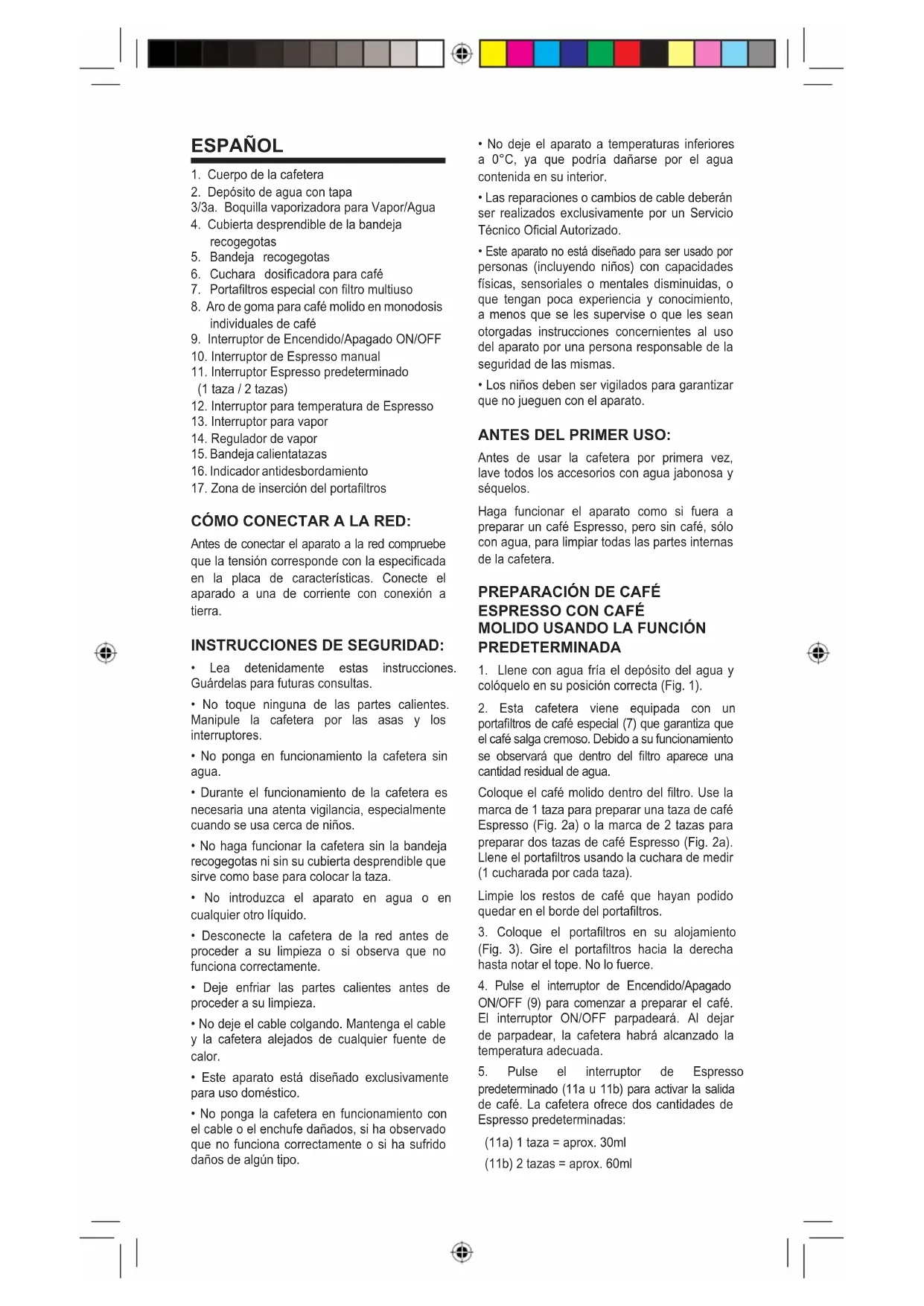 - Los niños deben ser vigilados para garantizar que no jueguen con el aparato. ANTES DEL PRIMER USO: Antes de usar la cafetera por primera vez, lave todos los accesorios con agua jabonosa y séquelos. Haga funcionar el aparato como si fuera a preparar un café Espresso, pero sin café, sólo con agua, para limpiar todas las partes internas de la cafetera.