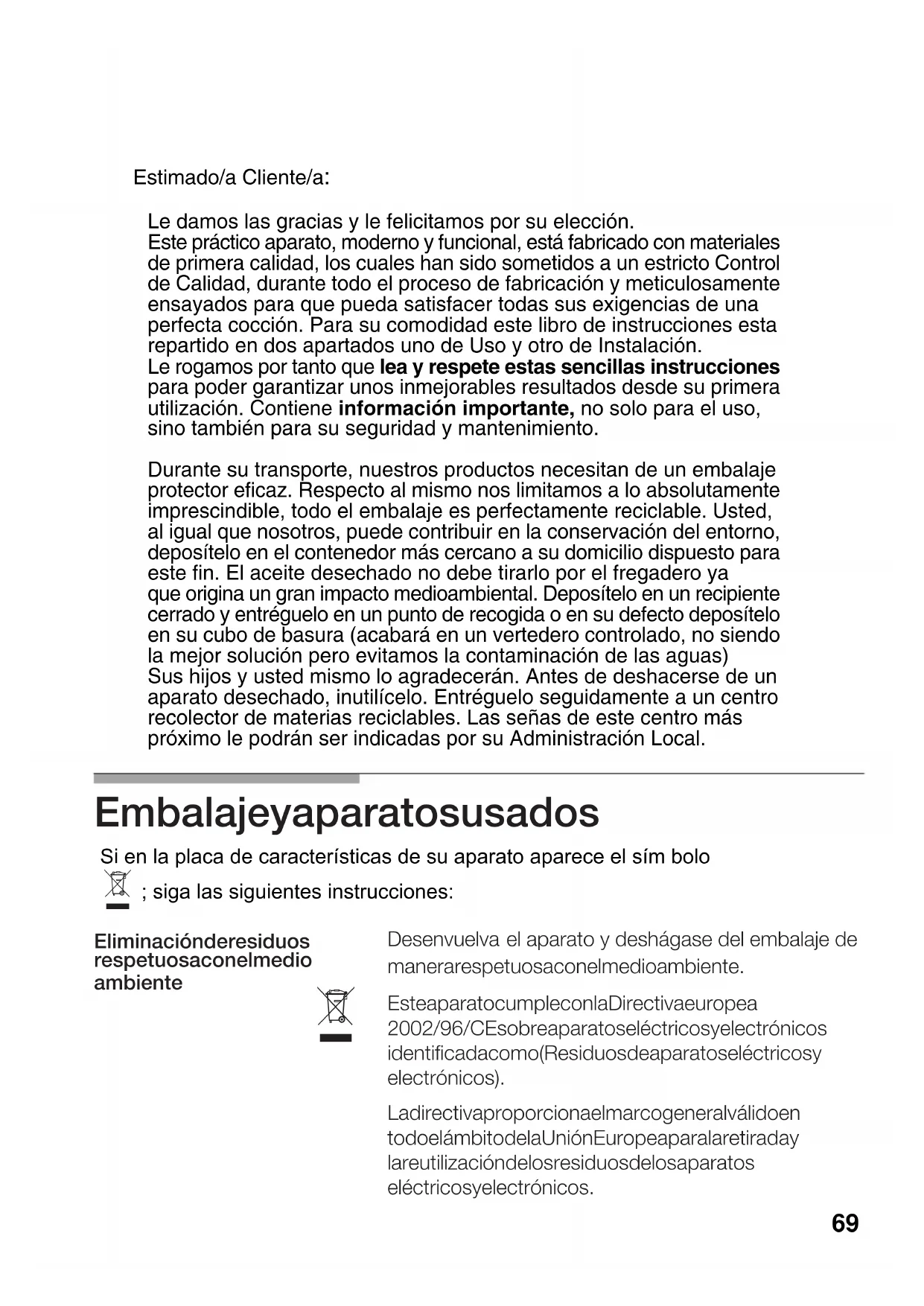 &4&/76&-7" &- "1"3"50 : %&4)<("4& %&- &.#"-"+& %& ."/&3" 3&41&5604" $0/ &- .&%*0 ".#*&/5&45& "1"3"50 $6.1-& $0/ -" *3&$5*7" &6301&" 40#3& "1"3"504 &-B$53*$04 : &-&$53D/*$04*%&/5*'*$"%" $0.0 &4*%604 %& "1"3"504 &-B$53*$04 :&-&$53D/*$04" %*3&$5*7" 130103$*0/" &- ."3$0 (&/&3"- 7<-*%0 &/50%0 &- <.#*50 %& -" /*D/ 6301&" 1"3" -" 3&5*3"%" :-" 3&65*-*;"$*D/ %& -04 3&4*%604 %& -04 "1"3"504&-B$53*$04 : &-&$53D/*$04 Si en la placa de características de su aparato aparece el sím bolo ; siga las siguientes instrucciones: 69CONTENIDO Advertencias de Seguridad Así se presenta su Placa de Cocción Quemadores de Gas Diámetros recipientes aconsejados Consejos de cocinado Advertencias de Uso Respecto del cocinado Respecto de la limpieza y conservación Situaciones anómalas Función reloj temporizador Programado Otras funciones El display digital