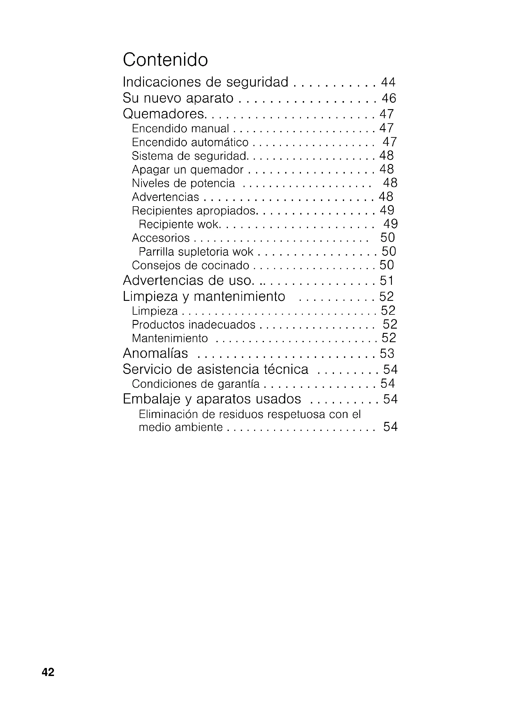 - Si no se produce el encendido, gire el mando a la posición de apagado y repita los pasos. Esta vez, mantenga el mando presionado durante más tiempo (hasta 10 segundos). ¡Atención! Si transcurridos 15 segundos la llama no se enciende, apague el quemador y abra la puerta o ventana del recinto. Espere al menos un minuto antes de intentar encender el quemador. Sistema de seguridad Según modelo, su placa de cocción puede disponer de un sistema de seguridad (termopar), que impide el paso de gas si los quemadores se apagan accidentalmente. Para garantizar que este dispositivo esté activo, encienda el quemador con normalidad y, sin soltar el mando, manténgalo presionado firmemente durante 4 segundos tras haberse encendido la llama. Apagar un quemador Gire el mando correspondiente hacia la derecha hasta la posición 0. Niveles de potencia Los mandos progresivos le permiten regular la potencia que necesite entre los niveles máximo y mínimo. Advertencias Durante el funcionamiento del quemador, es normal que se escuche un leve silbido. En los primeros usos es normal que se desprendan olores, esto no supone ningún riesgo ni mal funcionamiento, irán desapareciendo. Unos segundos después del apagado del quemador se producirá un sonido (golpe seco). No es ninguna anomalía, eso significa que la seguridad se ha desactivado. Mantenga la máxima limpieza. Si las bujías están sucias Bujía Termopar Posición Mando cerrado Llama grande Apertura o capacidad máximas y encendido eléctrico Llama pequeña Apertura o capacidad mínima49 el encendido será defectuoso. Límpielas periódicamente con un cepillo no metálico pequeño. Tenga en cuenta que las bujías no deben sufrir impactos violentos. Una llama de color naranja es normal. Se debe a la presencia de polvo en el ambiente, líquidos derramados, etc. El uso de un aparato de cocción a gas produce calor y humedad en el local donde está instalado. Debe asegurarse una buena ventilación de la cocina: mantenga abiertos los orificios de ventilación natural, o instale un dispositivo de ventilación mecánica (campana extractora). La utilización intensa y prolongada del aparato puede necesitar una ventilación complementaria, por ejemplo, abriendo una ventana, o una ventilación más eficaz, por ejemplo, aumentando la potencia de la ventilación mecánica, si existe. En el caso de una extinción accidental de las llamas del quemador, cierre el mando de accionamiento del quemador y no intente reencenderlo durante por lo menos 1 minuto. Recipientes apropiados Recipiente wok El wok es un utensilio de cocina originario de China, es una especie de sartén ligera, redonda, profunda, con asas y con base plana o cóncava. En el wok, los alimentos se pueden preparar de variadas formas: estofados, fritos, a fuego lento, al grill, además de al vapor. Se puede decir que el wok hace las veces de sartén y de olla, y gracias a su forma y tamaño, permite cocinar ingredientes de bastante tamaño. En el wok, el calor se distribuye de manera más uniforme y suave, el calor intenso que acumula permite que los alimentos se cocinen en menos tiempo, y además requiere menos aceite, por lo que es uno de los métodos de cocción más rápidos y saludables. Cuando utilice un recipiente wok, siga las instrucciones del fabricante. Quemador Diámetro mínimo del recipiente Diámetro máximo del recipiente Quemador de doble llama 22 cm Quemador rápido 22 cm 26 cm Quemador semi- rápido 14 cm 20 cm50 Accesorios Según modelo, la placa de cocción puede incluir los siguientes accesorios. Éstos también se pueden adquirir en el Servicio Técnico. Parrilla supletoria wok Para utilizar exclusivamente en el quemador de doble llama con recipientes de diámetro mayor de 26 cm (planchas de asado, cazuelas de barro, etc.) y con recipientes de base cóncava. El fabricante no asume responsabilidad si no se utilizan o se utilizan incorrectamente estas parrillas supletorias. Consejos de cocinado Quemador Muy fuerte Fuerte Medio Lento Quemador de doble llama Hervir, cocer, asar, dorar, paellas, comida asiática (wok). Recalentar y mantener calientes: platos preparados, platos cocinados. Quemador rápido Escalope, bistec, tortilla, frituras. Arroz, bechamel, ragout. Cocción al vapor: pescado, verduras. Quemador semi-rápido Patatas al vapor, verduras frescas, potajes, pastas. Recalentar y mantener calientes: platos cocinados y hacer guisos delicados.51 Advertencias de uso Los siguientes consejos le ayudarán a ahorrar energía y a evitar daños en los recipientes: Utilice recipientes de tamaño apropiado a cada quemador. No utilice recipientes pequeños en quemadores grandes. La llama no debe tocar los laterales del recipiente. No utilice recipientes deformados que se muestren inestables sobre la placa de cocción. Los recipientes podrían volcar. Utilice sólo recipientes de base plana y gruesa. No cocine sin tapa o con ésta desplazada, se desperdicia parte de la energía. Coloque el recipiente bien centrado sobre el quemador. En caso contrario podría volcar. No coloque los recipientes grandes en los quemadores cercanos a los mandos. Éstos pueden resultar dañados debido al exceso de temperatura. Coloque los recipientes sobre las parrillas, nunca directamente sobre el quemador. Maneje los recipientes con cuidado sobre la placa de cocción. No golpee la placa de cocción ni coloque sobre ella pesos excesivos. Asegúrese de que las parrillas y tapas de los quemadores estén bien colocadas antes de su uso.52 Limpieza y mantenimiento Limpieza Una vez frío el aparato, límpielo con una esponja, agua y jabón. Después de cada uso, limpie la superficie de los respectivos elementos del quemador una vez que se haya enfriado. Si se dejan restos (alimentos recocidos, gotas de grasa, etc.), por poco que sea, se incrustarán en la superficie y serán luego más difíciles de eliminar. Es necesario que los agujeros y ranuras estén limpios para que la llama sea correcta. El movimiento de