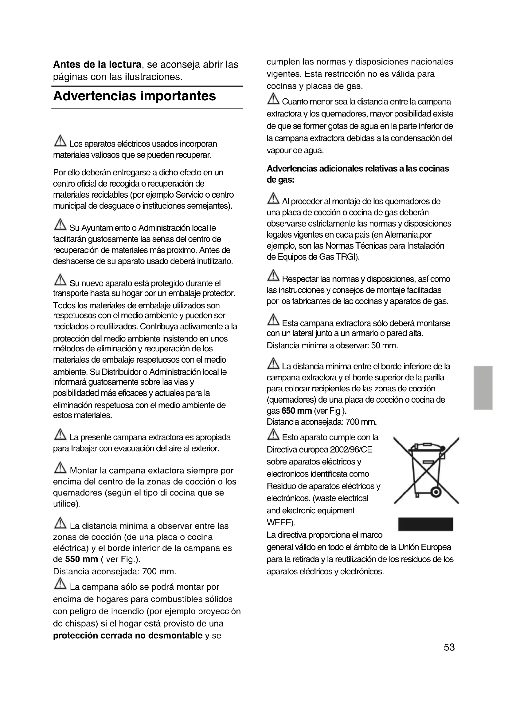La presente campana extractora es apropiada para trabajar con evacuación del aire al exterior. Montar la campana extactora siempre por encima del centro de la zonas de cocción o los quemadores (según el tipo di cocina que se utilice). La distancia minima a observar entre las zonas de cocción (de una placa o cocina eléctrica) y el borde inferior de la campana es de 550 mm ( ver Fig.). Distancia aconsejada: 700 mm. La campana sólo se podrá montar por encima de hogares para combustibles sólidos con peligro de incendio (por ejemplo proyección de chispas) si el hogar está provisto de una protección cerrada no desmontable y se cumplen las normas y disposiciones nacionales vigentes. Esta restricción no es válida para cocinas y placas de gas. Cuanto menor sea la distancia entre la campana extractora y los quemadores, mayor posibilidad existe de que se former gotas de agua en la parte inferior de la campana extractora debidas a la condensación del vapour de agua. Advertencias adicionales relativas a las cocinas de gas: Al proceder al montaje de los quemadores de una placa de cocción o cocina de gas deberán observarse estrictamente las normas y disposiciones legales vigentes en cada pais (en Alemania,por ejemplo, son las Normas Técnicas para Instalación de Equipos de Gas TRGI). Respectar las normas y disposiciones, así como las instrucciones y consejos de montaje facilitadas por los fabricantes de lac cocinas y aparatos de gas. Esta campana extractora sólo deberá montarse con un lateral junto a un armario o pared alta. Distancia minima a observar: 50 mm. La distancia minima entre el borde inferiore de la campana extractora y el borde superior de la parilla para colocar recipientes de las zonas de cocción (quemadores) de una placa de cocción o cocina de gas 650 mm (ver Fig ). Distancia aconsejada: 700 mm. Esto aparato cumple con la Directiva europea 2002/96/CE sobre aparatos eléctricos y electronicos identificata como Residuo de aparatos eléctricos y electrónicos. (waste electrical and electronic equipment WEEE). La directiva proporciona el marco general válido en todo el ámbito de la Unión Europea para la retirada y la reutilización de los residuos de los aparatos eléctricos y electrónicos.Antes del montaje Condiciones necesarias para lograr la optima potencia y rendimiento de la campana extractora: Tubo de evacuación corto y liso. Menor número de codas posible. Usar en lo possible tubos de gran diámetro, así como codos de gran tamaňo. Los tubos de evacuación largos y con desigualdades, y la utilización de muchos tubos y codos de diámetro pequeňo perjudica el rendimiento óptimo del aparato y provoca un aumento de ruidos desagradables durante su funcionamento. Tubos redondos: Se aconseja emplear tubos con un diámetro interior 150 mm. Los canales planos deberán poseer una sección interior equivalente a la de los tubos redondos. No deben presentar ángulos demasiado agudos. Ø 150 mm ca. 177cm