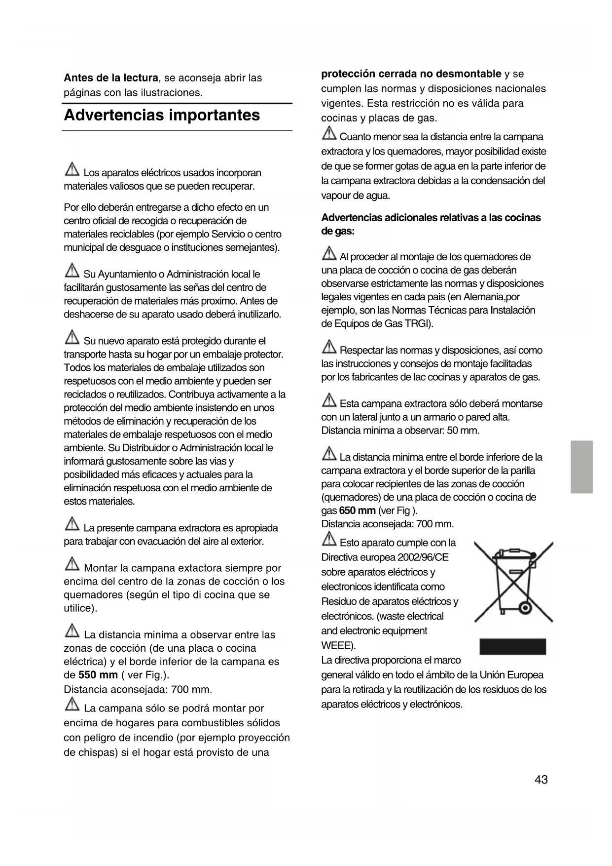 Antes de la lectura, se aconseja abrir las páginas con las ilustraciones. Advertencias importantes Los aparatos eléctricos usados incorporan materiales valiosos que se pueden recuperar. Por ello deberán entregarse a dicho efecto en un centro oficial de recogida o recuperación de materiales reciclables (por ejemplo Servicio o centro municipal de desguace o instituciones semejantes). Su Ayuntamiento o Administración local le facilitarán gustosamente las señas del centro de recuperación de materiales más proximo. Antes de deshacerse de su aparato usado deberá inutilizarlo. Su nuevo aparato está protegido durante el transporte hasta su hogar por un embalaje protector. Todos los materiales de embalaje utilizados son respetuosos con el medio ambiente y pueden ser reciclados o reutilizados. Contribuya activamente a la protección del medio ambiente insistendo en unos métodos de eliminación y recuperación de los materiales de embalaje respetuosos con el medio ambiente. Su Distribuidor o Administración local le informará gustosamente sobre las vias y posibilidaded más eficaces y actuales para la eliminación respetuosa con el medio ambiente de estos materiales. La presente campana extractora es apropiada para trabajar con evacuación del aire al exterior. Montar la campana extactora siempre por encima del centro de la zonas de cocción o los quemadores (según el tipo di cocina que se utilice). La distancia minima a observar entre las zonas de cocción (de una placa o cocina eléctrica) y el borde inferior de la campana es de 550 mm ( ver Fig.). Distancia aconsejada: 700 mm. La campana sólo se podrá montar por encima de hogares para combustibles sólidos con peligro de incendio (por ejemplo proyección de chispas) si el hogar está provisto de una protección cerrada no desmontable y se cumplen las normas y disposiciones nacionales vigentes. Esta restricción no es válida para cocinas y placas de gas. Cuanto menor sea la distancia entre la campana extractora y los quemadores, mayor posibilidad existe de que se former gotas de agua en la parte inferior de la campana extractora debidas a la condensación del vapour de agua. Advertencias adicionales relativas a las cocinas de gas: Al proceder al montaje de los quemadores de una placa de cocción o cocina de gas deberán observarse estrictamente las normas y disposiciones legales vigentes en cada pais (en Alemania,por ejemplo, son las Normas Técnicas para Instalación de Equipos de Gas TRGI). Respectar las normas y disposiciones, así como las instrucciones y consejos de montaje facilitadas por los fabricantes de lac cocinas y aparatos de gas. Esta campana extractora sólo deberá montarse con un lateral junto a un armario o pared alta. Distancia minima a observar: 50 mm. La distancia minima entre el borde inferiore de la campana extractora y el borde superior de la parilla para colocar recipientes de las zonas de cocción (quemadores) de una placa de cocción o cocina de gas 650 mm (ver Fig ). Distancia aconsejada: 700 mm. Esto aparato cumple con la Directiva europea 2002/96/CE sobre aparatos eléctricos y electronicos identificata como Residuo de aparatos eléctricos y electrónicos. (waste electrical and electronic equipment WEEE). La directiva proporciona el marco general válido en todo el ámbito de la Unión Europea para la retirada y la reutilización de los residuos de los aparatos eléctricos y electrónicos.44
