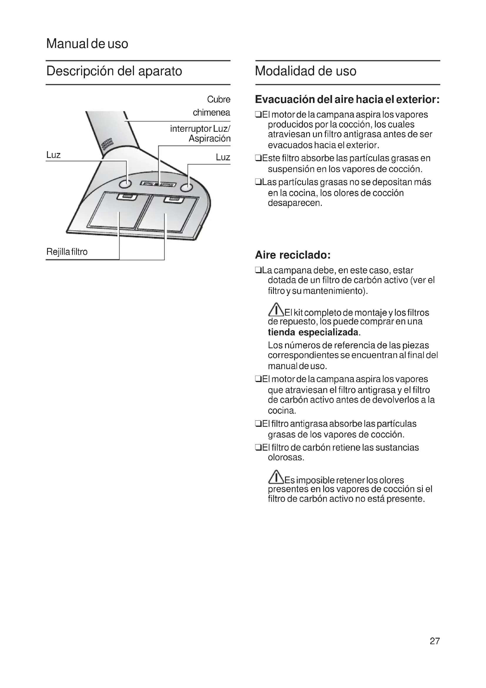 elektriciteitsnet aan of schakel de hoofdschakelaar weer in. In geval van problemen Indien U vragen heeft of indien storingen optreden neem contact op met de Klantenservice. (Zie de lijst met de Klantenservice vertegenwoordigers). Indien U opbelt de volgende gegevens vermelden: E-Nr. FD De belangrijke nummers hierboven invoeren. Het E-Nr. (productnummer) en de FD (productie datum) zijn te vinden op het Typeplaatje aan de binnenzijde van de kap en zijn zichtbaar als het filterframe wordt afgenomen.27 Manual de uso Modalidad de uso Evacuación del aire hacia el exterior: ❑ El motor de la campana aspira los vapores producidos por la cocción, los cuales atraviesan un filtro antigrasa antes de ser evacuados hacia el exterior. ❑ Este filtro absorbe las partículas grasas en suspensión en los vapores de cocción. ❑ Las partículas grasas no se depositan más en la cocina, los olores de cocción desaparecen. Aire reciclado: ❑ La campana debe, en este caso, estar dotada de un filtro de carbón activo (ver el filtro y su mantenimiento). El kit completo de montaje y los filtros de repuesto, los puede comprar en una tienda especializada. Los números de referencia de las piezas correspondientes se encuentran al final del manual de uso. ❑ El motor de la campana aspira los vapores que atraviesan el filtro antigrasa y el filtro de carbón activo antes de devolverlos a la cocina. ❑ El filtro antigrasa absorbe las partículas grasas de los vapores de cocción. ❑ El filtro de carbón retiene las sustancias olorosas. Es imposible retener los olores presentes en los vapores de cocción si el filtro de carbón activo no está presente. Cubre chimenea interruptor Luz/ Aspiración Luz Luz Rejilla filtro Descripción del aparato28 Antes del primer uso Advertencias importantes ❑ El presente manual de uso es válido para las diferentes versiones del aparato y puede contener descripciones de accesorios no presentes en su aparato. ❑ Esta campana de aspiración cumple con las disposiciones de seguridad vigentes. Las reparaciones tienen que ser efectuadas solamente por un especialista. Reparaciones llevadas a cabo por personas no calificadas, aumentan considerablemente los riesgos para el usuario. ❑ Leer con atención el presente manual de uso antes de utilizar el aparato por la primera vez. Contiene información importante no sólo para su seguridad, sino también para el uso y el mantenimiento del aparato. ❑ Conservar el presente manual de instalación y uso para un futuro propietario del aparato. Descargar los materiales de embalaje en conformidad con las leyes vigentes (ver manual de instalación). Esta campana de aspiración está destinada sólo para uso doméstico. Antes de cualquier operación de limpieza o mantenimento, desenchufar la campana o el interruptor general de la casa. El aparato no es destinado para el uso por parte de los niños o personas con problemas fisicos o mentales y sin experiencia y conocientos a menos que no sea bajo control de profesionales para el uso del aparato, una persona responsable para vuestra seguridad. Los niños deben ser controlados para evitar que jueguen con el aparato. Nunca utilizar la campana sin la parrilla correctamente montada! La campana no va Nunca utilizada como plano de apoyo solo si es expresamente indicado. El ambiente debe poseer suficiente ventilación, cuando la campana de cocina es utilizada conjuntamente con otros aparatos a gas u otros combustibles. El aire aspirado no debe ser mezclado en un conducto para descarga de humo producidos por aparatos a gas u otros combustibles. Es prohibido cocinar alimentos con llama alta por debajo de la campana. El uso de las llamas libres puede provocar daños a los filtros y dar lugar a incendios, por lo tanto evitar en cada caso. Las frituras deben ser cocinadas bajo control para evitar que el aceite recalentado prenda fuego. En cuanto a las medidas técnicas y de seguridad adoptar para la descarga de humo atenerse estrictamente a las reglas de las autoridades locales. La campana se debe limpiar siempre internamente y externamente (COMO MINIMO UNA VEZ AL MES, respetando las reglas indicadas en este manual) No efectuar los consejos de limpieza de la campana y el cambio de los filtros puede provocar incendios.29 Quemadores a gas y eléctricos No usar una encimera di cocción a gas con todos los quemadores encendidos a la máxima potencia por más de 15 minutos, de lo contrario podría haber el peligro que la superficie de la campana se recaliente causando quemaduras en caso de posible contacto con la campana. Además la campana podría dañarse. En el caso que se utilicen más de 3 quemadores a gas se debe usar la campana a la máxima potencia. ❑ Nota: un quemador grande con potencia superior a 5 KW (tipo WOK) corresponde a 2 quemadores estándar. ❑ Nunca usar las quemadores a gas sin las ollas. Regular la llama de manera que no vaya fuera del perímetro de la olla. No utilice o deje la campana sin las lámparas correctamente montadas, debido a riesgos de cortocircuito. Se declina todo tipo de responsabilidades, daños o incendios provocados por no leer atentamente las instrucciones indicadas en este manual.30 Uso de la campana de aspiración El modo más eficaz para eliminar los vapores de cocción es: ❑ Encender la campana al principio de la cocción. ❑ Apagar la campana solamente algunos minutos después de finalizar la cocción. Luz ON/OFF Potencia de aspiración Para encender: ❑ Pasar el interruptor de cursor hasta la potencia de aspiración escogida. Para apagar: ❑ Pasar el interruptor de cursor a la posición