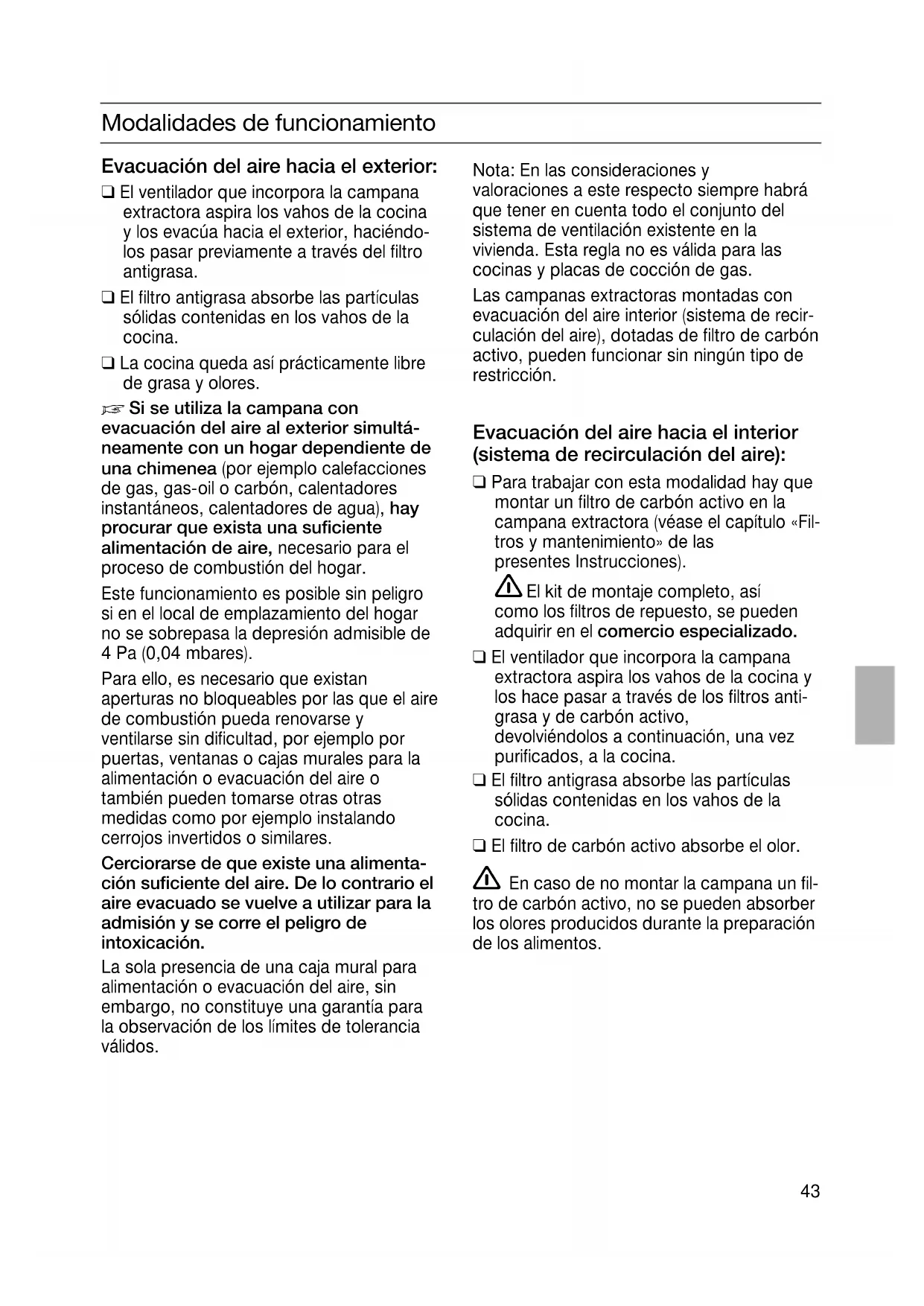 Si se utiliza la campana con evacuación del aire al exterior simultá- neamente con un hogar dependiente de una chimenea (por ejemplo calefacciones de gas, gas-oil o carbón, calentadores instantáneos, calentadores de agua), hay procurar que exista una suficiente alimentación de aire, necesario para el proceso de combustión del hogar. Este funcionamiento es posible sin peligro si en el local de emplazamiento del hogar no se sobrepasa la depresión admisible de 4 Pa (0,04 mbares). Para ello, es necesario que existan aperturas no bloqueables por las que el aire de combustión pueda renovarse y ventilarse sin dificultad, por ejemplo por puertas, ventanas o cajas murales para la alimentación o evacuación del aire o también pueden tomarse otras otras medidas como por ejemplo instalando cerrojos invertidos o similares. Cerciorarse de que existe una alimenta- ción suficiente del aire. De lo contrario el aire evacuado se vuelve a utilizar para la admisión y se corre el peligro de intoxicación. La sola presencia de una caja mural para alimentación o evacuación del aire, sin embargo, no constituye una garantía para la observación de los límites de tolerancia válidos. Nota: En las consideraciones y valoraciones a este respecto siempre habrá que tener en cuenta todo el conjunto del sistema de ventilación existente en la vivienda. Esta regla no es válida para las cocinas y placas de cocción de gas. Las campanas extractoras montadas con evacuación del aire interior (sistema de recir- culación del aire), dotadas de filtro de carbón activo, pueden funcionar sin ningún tipo de restricción. Evacuación del aire hacia el interior (sistema de recirculación del aire): ❑ Para trabajar con esta modalidad hay que montar un filtro de carbón activo en la campana extractora (véase el capítulo «Fil- tros y mantenimiento» de las presentes Instrucciones).