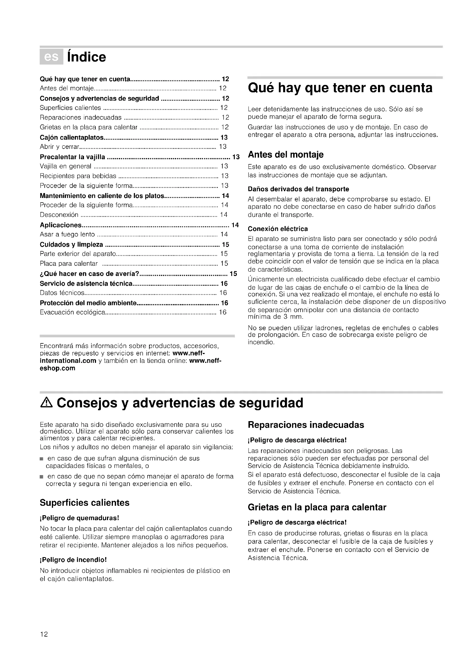 - Evacuación ecológica Produktinfo Encontrará más información sobre productos, accesorios, piezas de repuesto y servicios en internet: www.neff- international.com y también en la tienda online: www.neff- eshop.com Qué hay que tener en cuenta Leer detenidamente las instrucciones de uso. Sólo así se puede manejar el aparato de forma segura. Guardar las instrucciones de uso y de montaje. En caso de entregar el aparato a otra persona, adjuntar las instrucciones. Antes del montaje Este aparato es de uso exclusivamente doméstico. Observar las instrucciones de montaje que se adjuntan. Daños derivados del transporte Al desembalar el aparato, debe comprobarse su estado. El aparato no debe conectarse en caso de haber sufrido daños durante el transporte. Conexión eléctrica El aparato se suministra listo para ser conectado y sólo podrá conectarse a una toma de corriente de instalación reglamentaria y provista de toma a tierra. La tensión de la red debe coincidir con el valor de tensión que se indica en la placa de características. Únicamente un electricista cualificado debe efectuar el cambio de lugar de las cajas de enchufe o el cambio de la línea de conexión. Si una vez realizado el montaje, el enchufe no está lo suficiente cerca, la instalación debe disponer de un dispositivo de separación omnipolar con una distancia de contacto mínima de 3 mm. No se pueden utilizar ladrones, regletas de enchufes o cables de prolongación. En caso de sobrecarga existe peligro de incendio. ã=Consejos y advertencias de seguridad Este aparato ha sido diseñado exclusivamente para su uso doméstico. Utilizar el aparato sólo para conservar calientes los alimentos y para calentar recipientes. Los niños y adultos no deben manejar el aparato sin vigilancia: ■ en caso de que sufran alguna disminución de sus capacidades físicas o mentales, o ■ en caso de que no sepan cómo manejar el aparato de forma correcta y segura ni tengan experiencia en ello. Superficies calientes ¡Peligro de quemaduras! No tocar la placa para calentar del cajón calientaplatos cuando esté caliente. Utilizar siempre manoplas o agarradores para retirar el recipiente. Mantener alejados a los niños pequeños. ¡Peligro de incendio! No introducir objetos inflamables ni recipientes de plástico en el cajón calientaplatos. Reparaciones inadecuadas ¡Peligro de descarga eléctrica! Las reparaciones inadecuadas son peligrosas. Las reparaciones sólo pueden ser efectuadas por personal del Servicio de Asistencia Técnica debidamente instruido. Si el aparato está defectuoso, desconectar el fusible de la caja de fusibles y extraer el enchufe. Ponerse en contacto con el Servicio de Asistencia Técnica. Grietas en la placa para calentar ¡Peligro de descarga eléctrica! En caso de producirse roturas, grietas o fisuras en la placa para calentar, desconectar el fusible de la caja de fusibles y extraer el enchufe. Ponerse en contacto con el Servicio de Asistencia Técnica.13 Cajón calientaplatos En el cajón calientaplatos se puede precalentar la vajilla o mantener calientes los platos. El aparato sólo calienta si el cajón está debidamente cerrado. Abrir y cerrar En los aparatos sin tirador: Empujar la parte central del cajón para abrirlo o cerrarlo. Al abrir el cajón, éste salta ligeramente hacia fuera. Tras ello, puede extraerse sin problemas. Precalentar la vajilla En la vajilla previamente calentada, los alimentos no se enfrían tan rápidamente. Las bebidas se mantienen calientes durante más tiempo. Vajilla en general La carga máxima del cajón calientaplatos es de 25 kg. Puede precalentar, p. ej., vajilla para 6 o 12 personas. Colocar la vajilla Distribuir la vajilla por toda la superficie en la medida que sea posible. Una pila alta de platos se calienta más despacio que una sola pieza de la vajilla, como p. ej. 2 fuentes. Recipientes para bebidas Utilizar el nivel 2 para calentar recipientes para bebidas como tazas de café. ã=¡Peligro de quemaduras! En el nivel 3 o 4, los recipientes para bebidas se calienta demasiado. Proceder de la siguiente forma p. 16