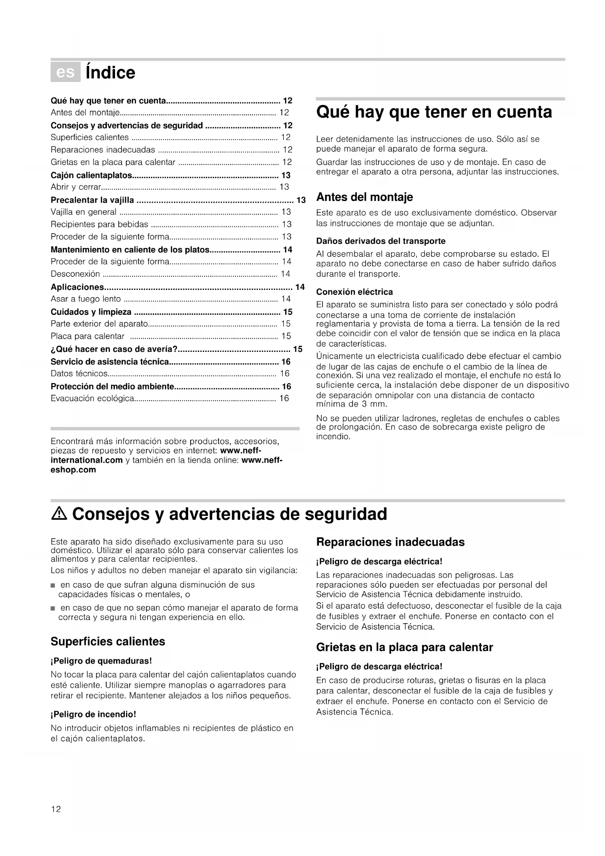 - Evacuación ecológica Produktinfo Encontrará más información sobre productos, accesorios, piezas de repuesto y servicios en internet: www.neff- international.com y también en la tienda online: www.neff- eshop.com Qué hay que tener en cuenta Leer detenidamente las instrucciones de uso. Sólo así se puede manejar el aparato de forma segura. Guardar las instrucciones de uso y de montaje. En caso de entregar el aparato a otra persona, adjuntar las instrucciones. Antes del montaje Este aparato es de uso exclusivamente doméstico. Observar las instrucciones de montaje que se adjuntan. Daños derivados del transporte Al desembalar el aparato, debe comprobarse su estado. El aparato no debe conectarse en caso de haber sufrido daños durante el transporte. Conexión eléctrica El aparato se suministra listo para ser conectado y sólo podrá conectarse a una toma de corriente de instalación reglamentaria y provista de toma a tierra. La tensión de la red debe coincidir con el valor de tensión que se indica en la placa de características. Únicamente un electricista cualificado debe efectuar el cambio de lugar de las cajas de enchufe o el cambio de la línea de conexión. Si una vez realizado el montaje, el enchufe no está lo suficiente cerca, la instalación debe disponer de un dispositivo de separación omnipolar con una distancia de contacto mínima de 3 mm. No se pueden utilizar ladrones, regletas de enchufes o cables de prolongación. En caso de sobrecarga existe peligro de incendio. ã=Consejos y advertencias de seguridad Este aparato ha sido diseñado exclusivamente para su uso doméstico. Utilizar el aparato sólo para conservar calientes los alimentos y para calentar recipientes. Los niños y adultos no deben manejar el aparato sin vigilancia: ■ en caso de que sufran alguna disminución de sus capacidades físicas o mentales, o ■ en caso de que no sepan cómo manejar el aparato de forma correcta y segura ni tengan experiencia en ello. Superficies calientes ¡Peligro de quemaduras! No tocar la placa para calentar del cajón calientaplatos cuando esté caliente. Utilizar siempre manoplas o agarradores para retirar el recipiente. Mantener alejados a los niños pequeños. ¡Peligro de incendio! No introducir objetos inflamables ni recipientes de plástico en el cajón calientaplatos. Reparaciones inadecuadas ¡Peligro de descarga eléctrica! Las reparaciones inadecuadas son peligrosas. Las reparaciones sólo pueden ser efectuadas por personal del Servicio de Asistencia Técnica debidamente instruido. Si el aparato está defectuoso, desconectar el fusible de la caja de fusibles y extraer el enchufe. Ponerse en contacto con el Servicio de Asistencia Técnica. Grietas en la placa para calentar ¡Peligro de descarga eléctrica! En caso de producirse roturas, grietas o fisuras en la placa para calentar, desconectar el fusible de la caja de fusibles y extraer el enchufe. Ponerse en contacto con el Servicio de Asistencia Técnica.13 Cajón calientaplatos En el cajón calientaplatos se puede precalentar la vajilla o mantener calientes los platos. El aparato sólo calienta si el cajón está debidamente cerrado. Abrir y cerrar En los aparatos sin tirador: Empujar la parte central del cajón para abrirlo o cerrarlo. Al abrir el cajón, éste salta ligeramente hacia fuera. Tras ello, puede extraerse sin problemas. Precalentar la vajilla En la vajilla previamente calentada, los alimentos no se enfrían tan rápidamente. Las bebidas se mantienen calientes durante más tiempo. Vajilla en general La carga máxima del cajón calientaplatos es de 25 kg. Puede precalentar, p. ej., vajilla para 6 o 12 personas. Colocar la vajilla Distribuir la vajilla por toda la superficie en la medida que sea posible. Una pila alta de platos se calienta más despacio que una sola pieza de la vajilla, como p. ej. 2 fuentes. Recipientes para bebidas Utilizar el nivel 2 para calentar recipientes para bebidas como tazas de café. ã=¡Peligro de quemaduras! En el nivel 3 o 4, los recipientes para bebidas se calienta demasiado. Proceder de la siguiente forma p. 16
