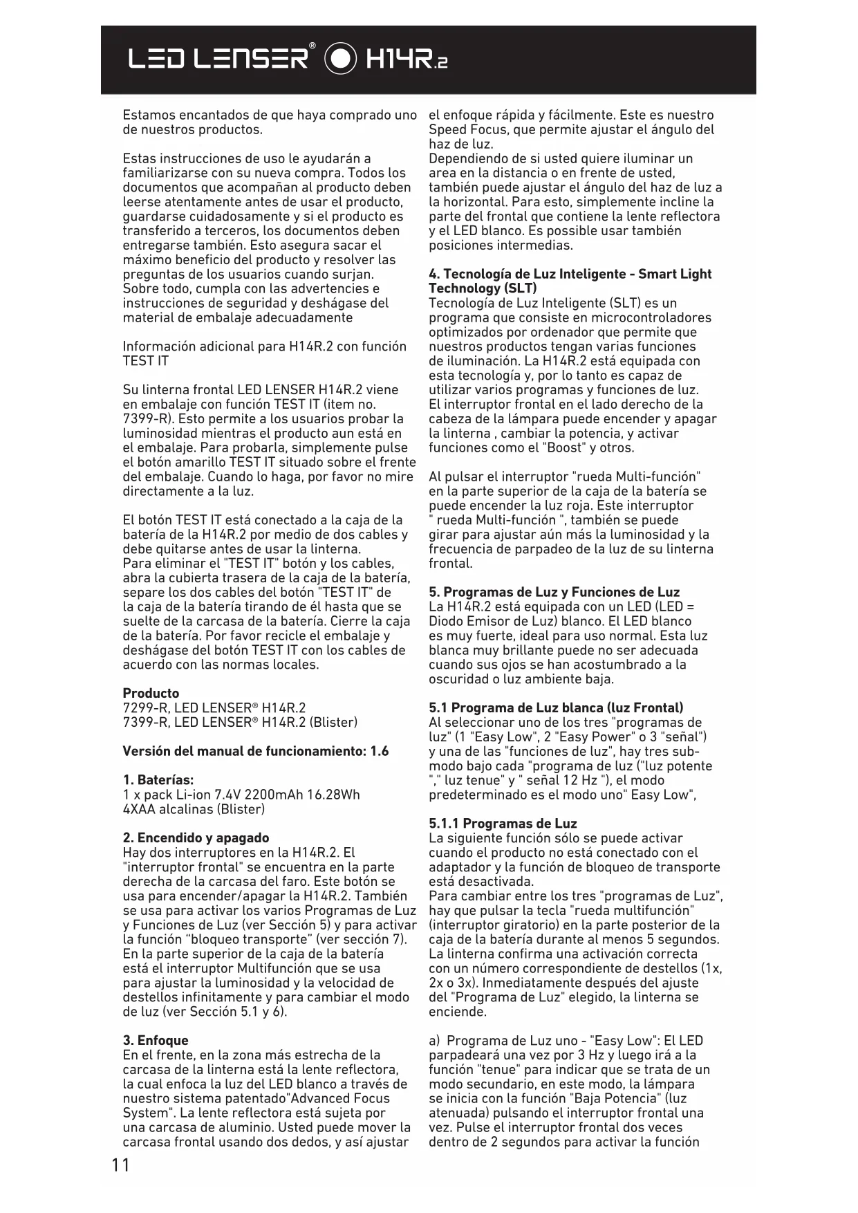 Tecnología de Luz Inteligente (SLT) es un programa que consiste en microcontroladores optimizados porordenador que permit que nuestros produits tengan variasmericanas de iluminación. La H14R.2 está equipada con esta Tecnología y, por lo tanto es capaz de utiliser various programas ymericanas de luz. El interruptor frontal en el lado derecho de lackeza de la lámpara pueda encender y apagar la linterna, Cambiar la potencia, yactivarmericanas como el "Boost" yotiros.