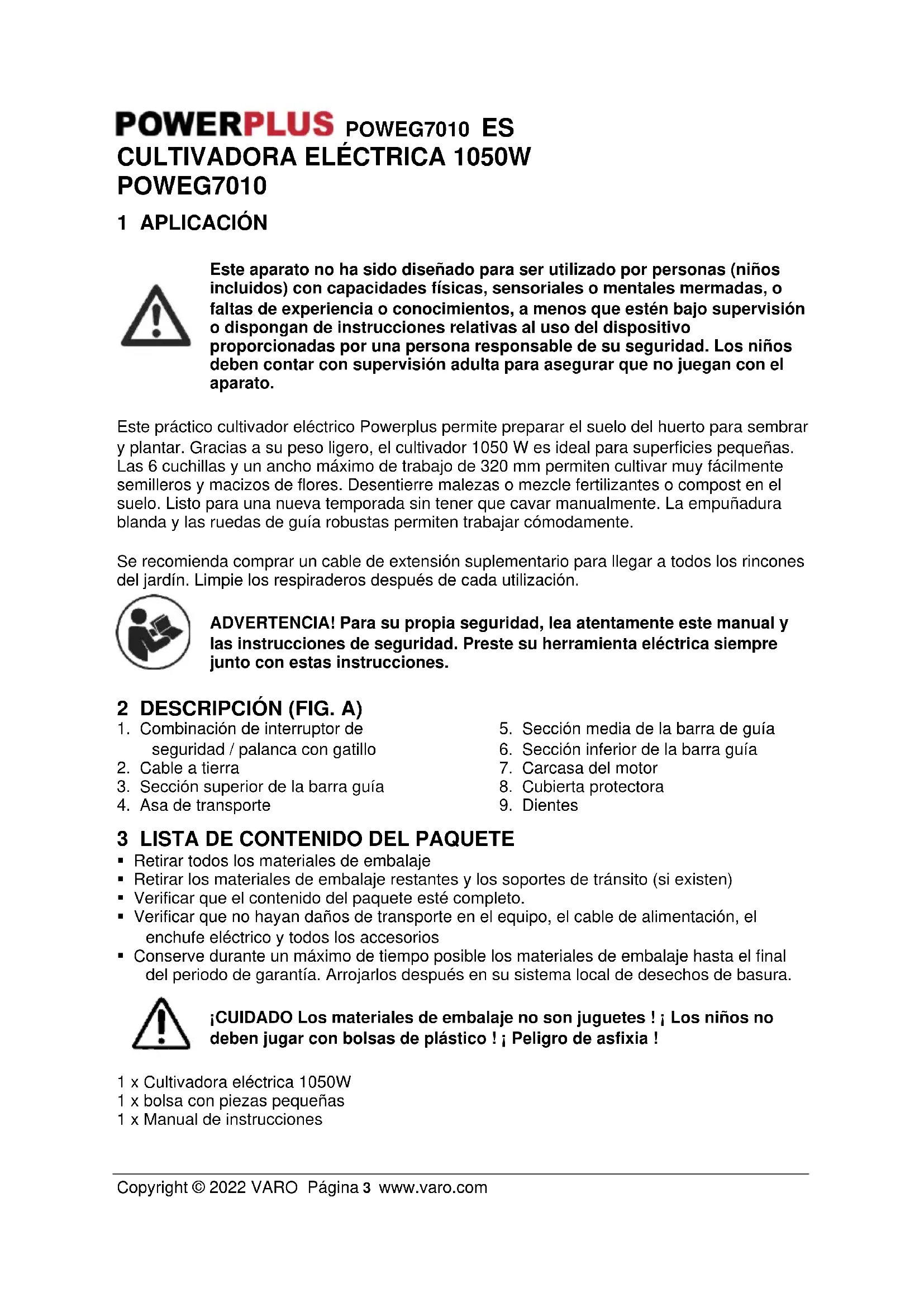- Conserve durante un máximo de tiempo posible los materiales de embalaje hasta el final del periodo de garantía. Arrojarlos después en su sistema local de desechos de basura. ¡CUIDADO Los materiales de embalaje no son juguetes ! ¡ Los niños no deben jugar con bolsas de plástico ! ¡ Peligro de asfixia ! 1 x Cultivadora eléctrica 1050W 1 x bolsa con piezas pequeñas 1 x Manual de instruccionesPOWEG7010 ES Copyright © 2022 VARO Página 4 www.varo.com En el caso que falten piezas o que hayan piezas dañadas, ponerse en contacto con el vendedor. 4 SÍMBOLOS En este manual y/o en el aparato mismo se utilizan los siguientes símbolos: