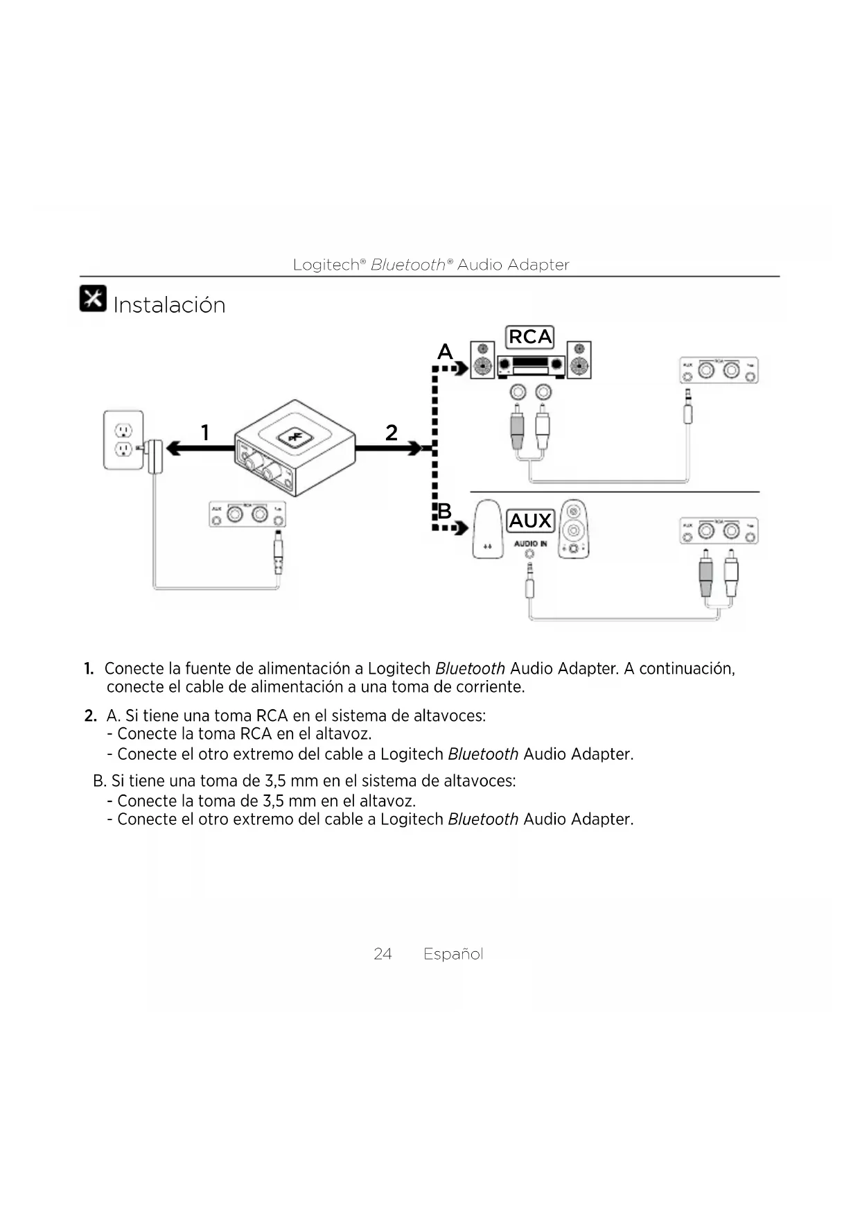 - Conecte la toma RCA en el altavoz. - Conecte el otro extremo del cable a Logitech Bluetooth Audio Adapter. B. Si tiene una toma de 3,5 mm en el sistema de altavoces: - Conecte la toma de 3,5 mm en el altavoz. - Conecte el otro extremo del cable a Logitech Bluetooth Audio Adapter.Logitech® Bluetooth® Audio Adapter 25 Español