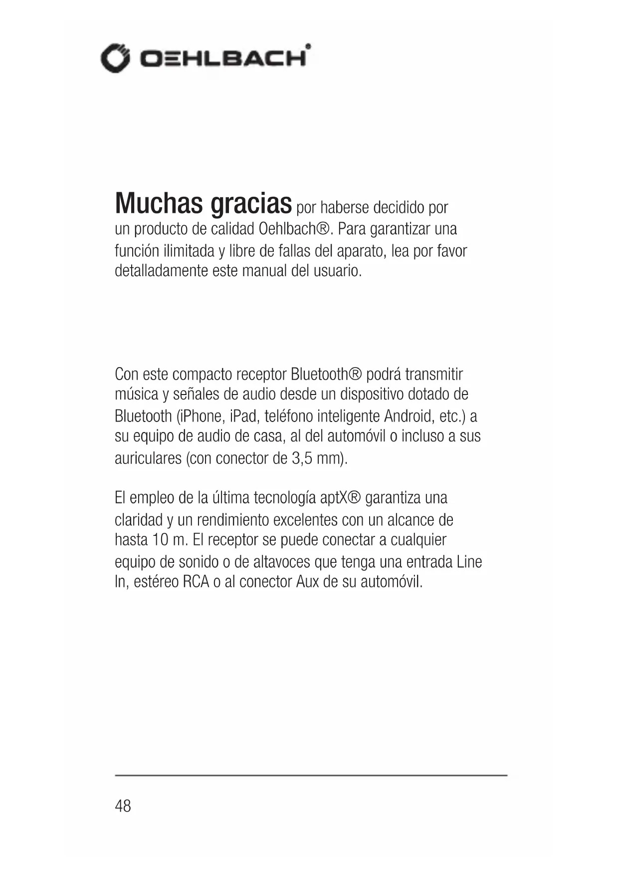 - rimborso delle spese in caso di riparazione del danno da parte di terzi senza il previo consenso da parte nostra48 Muchas gracias por haberse decidido por un producto de calidad Oehlbach®. Para garantizar una función ilimitada y libre de fallas del aparato, lea por favor detalladamente este manual del usuario. Con este compacto receptor Bluetooth® podrá transmitir música y señales de audio desde un dispositivo dotado de Bluetooth (iPhone, iPad, teléfono inteligente Android, etc.) a su equipo de audio de casa, al del automóvil o incluso a sus auriculares (con conector de 3,5 mm). El empleo de la última tecnología aptX® garantiza una claridad y un rendimiento excelentes con un alcance de hasta 10 m. El receptor se puede conectar a cualquier equipo de sonido o de altavoces que tenga una entrada Line In, estéreo RCA o al conector Aux de su automóvil.49 ESP BTX 1000 Funciones ∙ Audio Streaming desde cualquier dispositivo Bluetooth® ∙ Bluetooth de audio de elevada calidad con soporte aptX® ∙ El formato de audio permite hasta 44,1 kHz y 16 bits (calidad de CD) ∙ Compatible con Bluetooth 4.0 ∙ Hasta 10 horas de música seguidas Especificación Alcance: Hasta 10 m Velocidad de transmisión de datos: Hasta 352 kbps Duración de la batería: Hasta 10 horas Respuesta de frecuencia: De 10 Hz a 22 kHz Rango de temperatura: -15 hasta +50 °C Humedad ambiental relativa permitida: 5 hasta 90 % Dimensiones (an. x al. x ho.): 28 x 16 x 78 mm Contenido del paquete: ∙ Receptor de audio Bluetooth BTX1000 Oehlbach ∙ Cable USB tipo A a micro USB ∙ Adaptador de 3,5 mm a estéreo RCA ∙ Manual del usuario50 Uso Acoplamiento con dispositivos Bluetooth: