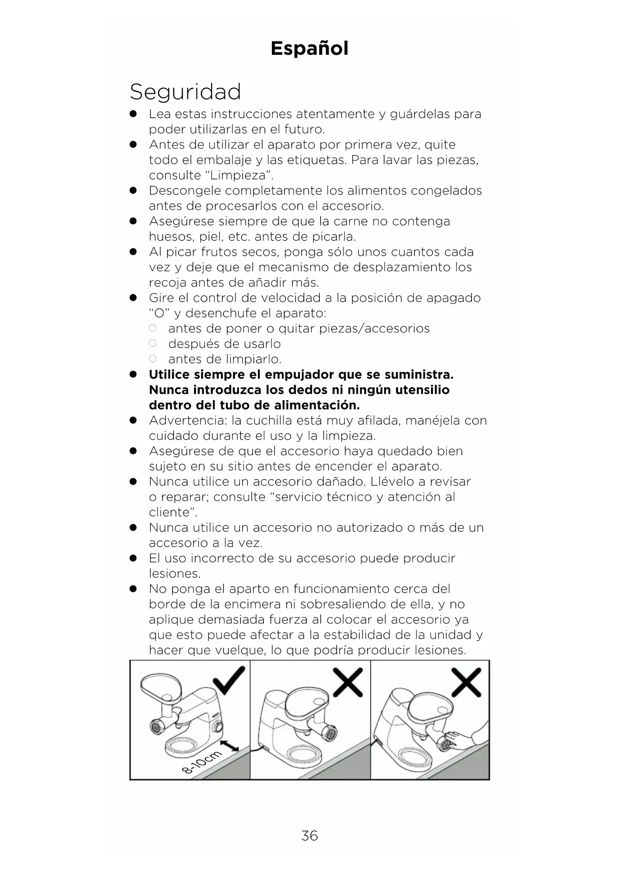 Fabricado na China.36 Seguridad OLea estas instrucciones atentamente y guárdelas para poder utilizarlas en el futuro.OAntes de utilizar el aparato por primera vez, quite todo el embalaje y las etiquetas. Para lavar las piezas, consulte “Limpieza”.ODescongele completamente los alimentos congelados antes de procesarlos con el accesorio.OAsegúrese siempre de que la carne no contenga huesos, piel, etc. antes de picarla.OAl picar frutos secos, ponga sólo unos cuantos cada vez y deje que el mecanismo de desplazamiento los recoja antes de añadir más.OGire el control de velocidad a la posición de apagado “O” y desenchufe el aparato: