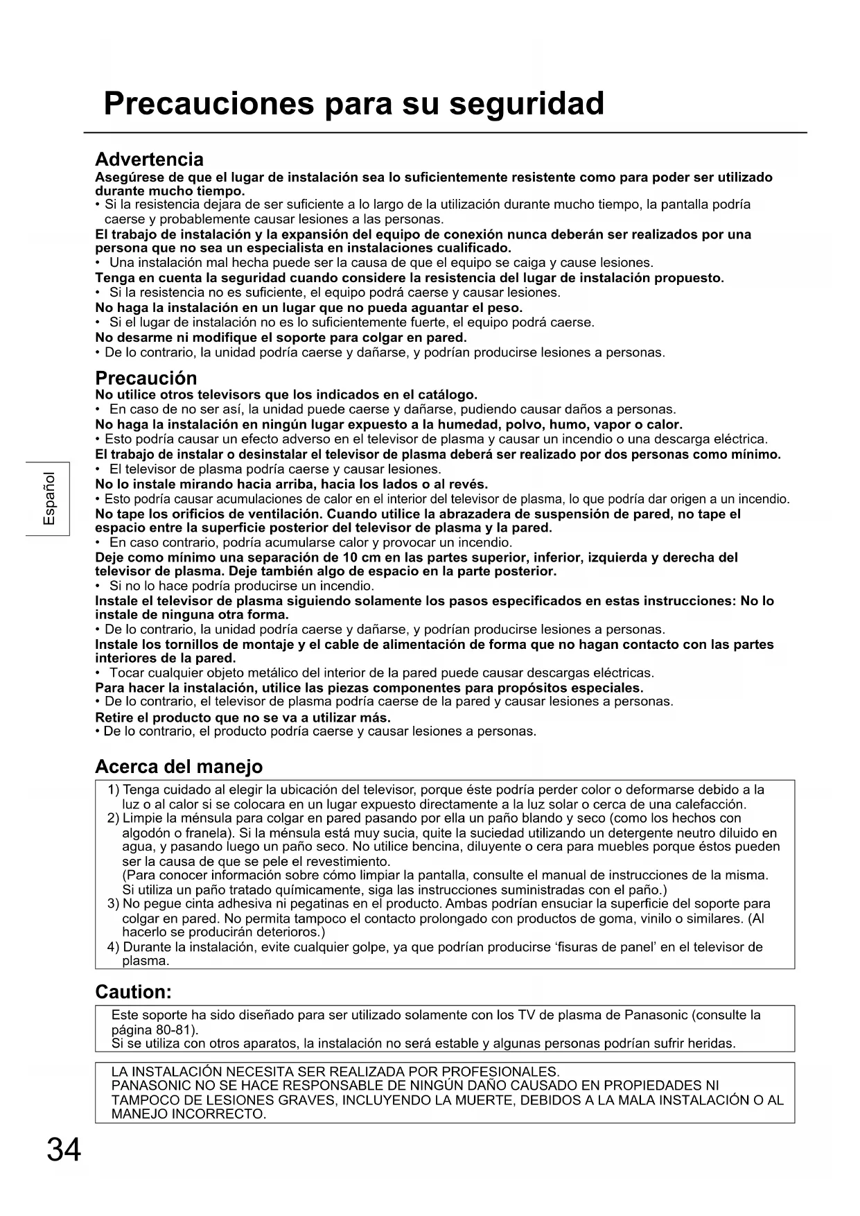 plasma. Caution: Este soporte ha sido diseñado para ser utilizado solamente con los TV de plasma de Panasonic (consulte la página 80-81). Si se utiliza con otros aparatos, la instalación no será estable y algunas personas podrían sufrir heridas. LA INSTALACIÓN NECESITA SER REALIZADA POR PROFESIONALES. PANASONIC NO SE HACE RESPONSABLE DE NINGÚN DAÑO CAUSADO EN PROPIEDADES NI TAMPOCO DE LESIONES GRAVES, INCLUYENDO LA MUERTE, DEBIDOS A LA MALA INSTALACIÓN O AL MANEJO INCORRECTO.35 Español Componentes [ Las imágenes mostradas en este manual sólo tienen fines ilustrativos. ] TY-WK5P1RW Soporte para colgar en pared (Tipo de ángulo ajustable) Piezas utilizadas para ensamblar el soporte para colgar en pared Accesorio superior de la base (1) Accesorio izquierdo de la base del soporte (1) Accesorio derecho de la base del soporte (1) Tornillos M5x10 para ensamblar el soporte (4) Accesorio inferior de la base (1)Etiqueta Piezas utilizadas para la instalación Vista del soporte completamente ensamblado Tornillos Allen M8×32 de cabeza avellanada (4) Espaciadores (4) Arandelas dentadas convexas (4) M5x50 Tornillo para asegurar la unidad (2) Espaciadores de aislamiento (4) Llave Allen (herramienta incluida) (1) Precauciones para la instalación del soporte para colgar en pared ♦ El soporte para colgar en pared se utiliza para colocar un televisor de plasma en una pared vertical. No lo instale en ninguna otra superficie que no sea una pared vertical. ♦ Para asegurar el correcto funcionamiento del televisor de plasma y evitar problemas, no lo instale en ninguna de las ubicaciones siguientes. • Cerca de rociadores o detectores de fuego/humo • Donde corra el riesgo de quedar expuesto a vibraciones o golpes • Cerca de cables de alta tensión o fuentes de alimentación • Cerca de campos magnéticos, fuentes de calor, vapor de agua u hollín • Lugares expuestos a la salida del aire de equipos de calefacción • Donde se puedan formar gotas de condensación de un acondicionador de aire o de otro aparato ♦ Haga la instalación utilizando técnicas adecuadas a la estructura y materiales del lugar de instalación. ♦ Utilice tornillos comercialmente disponibles de 6 mm de diámetro diseñados para el material donde se instale el soporte para colgar en pared (madera, bastidor de acero, hormigón etc.). ♦ Conecte el televisor a una toma de corriente a la que pueda accederse fácilmente. ♦ Deje un espacio suficiente para que circule el aire y la temperatura del equipo no supere los 40 °C. De lo contrario, se acumulará calor en el interior del televisor de plasma y éste podrá funcionar mal. ♦ Extienda una manta o paño blando sobre el suelo para que el televisor de plasma y el suelo no queden marcados ni arañados durante el trabajo de montaje e instalación. ♦ Cuando atornille piezas, asegúrese de que los tornillos no estén flojos ni excesivamente apretados. ♦ Tenga suficiente cuidado para garantizar la seguridad a su alrededor cuando realice el trabajo de montaje e instalación o mientras se mueve durante el curso del trabajo. ♦ No instale el televisor de plasma debajo de lámparas del techo (luces direccionales, lámparas halógenas, etc.). De lo contrario, la caja puede doblarse o dañarse debido al calor intenso.36 Español Procedimiento de instalación [ Para hacer la instalación no utilice ningún otro método diferente del especificado.]