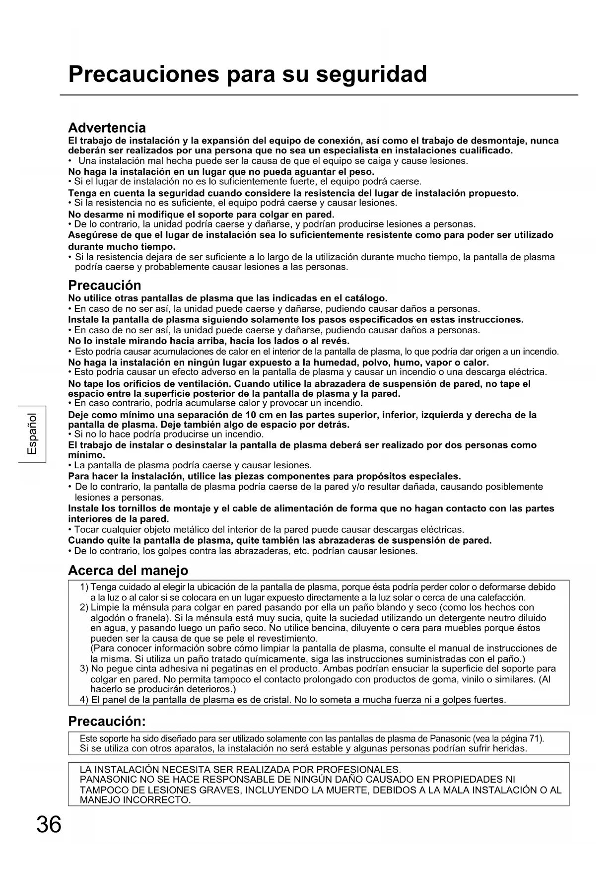 Precaución: Este soporte ha sido diseñado para ser utilizado solamente con las pantallas de plasma de Panasonic (vea la página 71). Si se utiliza con otros aparatos, la instalación no será estable y algunas personas podrían sufrir heridas. LA INSTALACIÓN NECESITA SER REALIZADA POR PROFESIONALES. PANASONIC NO SE HACE RESPONSABLE DE NINGÚN DAÑO CAUSADO EN PROPIEDADES NI TAMPOCO DE LESIONES GRAVES, INCLUYENDO LA MUERTE, DEBIDOS A LA MALA INSTALACIÓN O AL MANEJO INCORRECTO.37 Español Componentes Precauciones para la instalación del soporte para colgar en pared ♦ El soporte para colgar en pared se utiliza para colocar una pantalla de plasma en una pared vertical. No lo instale en ninguna otra superficie que no sea una pared vertical. ♦ Para asegurar el correcto funcionamiento de la pantalla de plasma y evitar problemas, no la instale en ninguna de las ubicaciones siguientes.