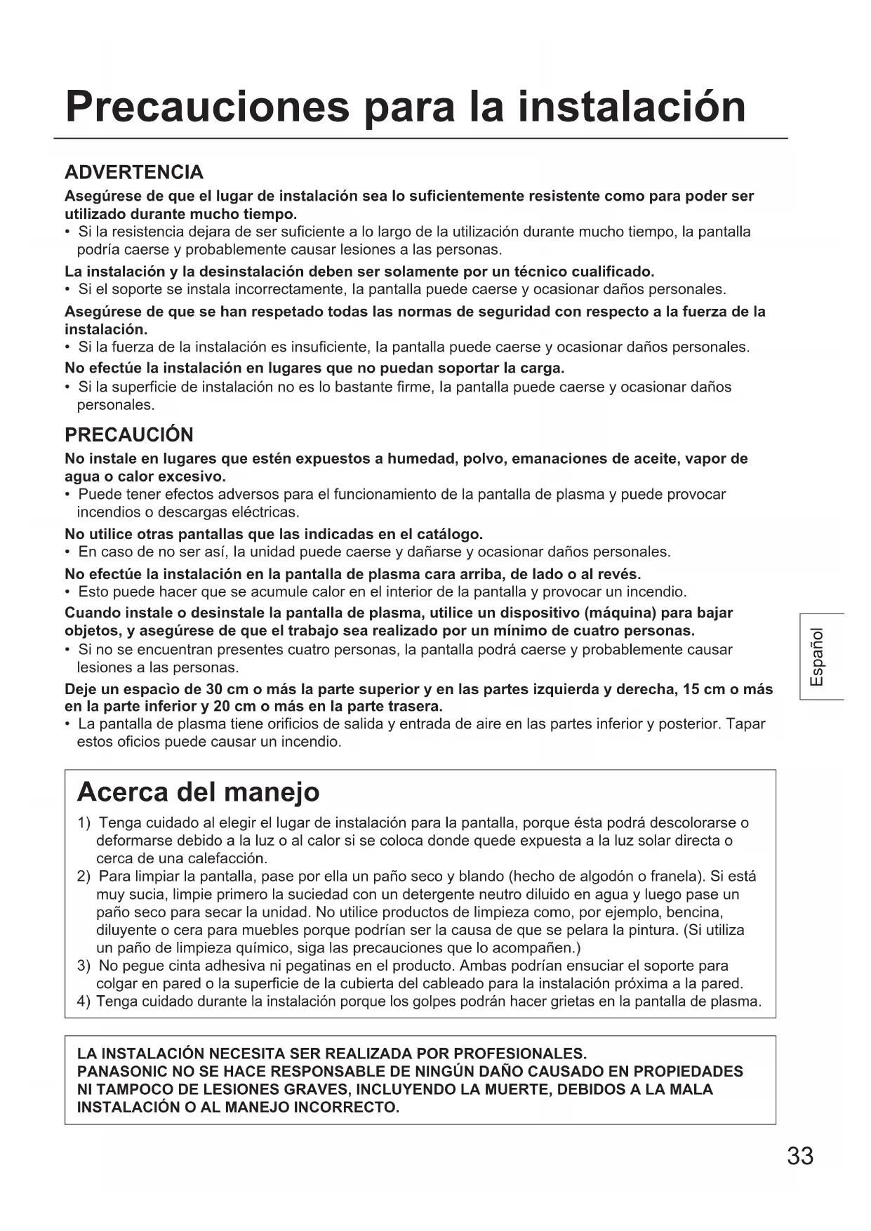 Serrez fermement les crans de sûreté (x2) déposés précédemment avec les vis de fixation du cran de sûreté. Retrait de l’écran Français Installation horizontale Installation verticale Vis de fixation du cran de sûretéCran de sûretéVis de fixation du cran de sûretéCran de sûretéEncoches (Pour installation horizontale)Encoches (Pour installation verticale) ● Veillez à bien serrer les crans de sûreté gauche et droit pour empêcher l’écran de se détacher de l’applique de fixation au mur. Attention Cran de sûreté ● Pour déposer l’écran, soulevez-le d’environ 60 mm. Remarque Déposez les crans de sûreté (x2) qui étaient fixés aux appliques de fixation au mur. Soulevez l'écran tout droit.33 ADVERTENCIA Asegúrese de que el lugar de instalación sea lo suficientemente resistente como para poder ser utilizado durante mucho tiempo.• Si la resistencia dejara de ser suficiente a lo largo de la utilización durante mucho tiempo, la pantalla podría caerse y probablemente causar lesiones a las personas.La instalación y la desinstalación deben ser solamente por un técnico cualificado.• Si el soporte se instala incorrectamente, Ia pantalla puede caerse y ocasionar daños personales.Asegúrese de que se han respetado todas las normas de seguridad con respecto a la fuerza de la instalación.• Si la fuerza de la instalación es insuficiente, Ia pantalla puede caerse y ocasionar daños personales.No efectúe la instalación en lugares que no puedan soportar la carga.• Si la superficie de instalación no es lo bastante firme, Ia pantalla puede caerse y ocasionar daños personales. PRECAUCIÓN No instale en lugares que estén expuestos a humedad, polvo, emanaciones de aceite, vapor de agua o calor excesivo.• Puede tener efectos adversos para el funcionamiento de la pantalla de plasma y puede provocar incendios o descargas eléctricas.No utilice otras pantallas que las indicadas en el catálogo.• En caso de no ser así, Ia unidad puede caerse y dañarse y ocasionar daños personales.No efectúe la instalación en la pantalla de plasma cara arriba, de lado o al revés.• Esto puede hacer que se acumule calor en el interior de la pantalla y provocar un incendio.Cuando instale o desinstale la pantalla de plasma, utilice un dispositivo (máquina) para bajar objetos, y asegúrese de que el trabajo sea realizado por un mínimo de cuatro personas.• Si no se encuentran presentes cuatro personas, la pantalla podrá caerse y probablemente causar lesiones a las personas.Deje un espacìo de 30 cm o más la parte superior y en las partes izquierda y derecha, 15 cm o más en la parte inferior y 20 cm o más en la parte trasera.• La pantalla de plasma tiene orificios de salida y entrada de aire en las partes inferior y posterior. Tapar estos oficios puede causar un incendio. Acerca del manejo 1) Tenga cuidado al elegir el lugar de instalación para la pantalla, porque ésta podrá descolorarse o deformarse debido a la luz o al calor si se coloca donde quede expuesta a la luz solar directa o cerca de una calefacción.2) Para limpiar la pantalla, pase por ella un paño seco y blando (hecho de algodón o franela). Si está muy sucia, limpie primero la suciedad con un detergente neutro diluido en agua y luego pase un paño seco para secar la unidad. No utilice productos de limpieza como, por ejemplo, bencina, diluyente o cera para muebles porque podrían ser la causa de que se pelara la pintura. (Si utiliza un paño de limpieza químico, siga las precauciones que lo acompañen.)3) No pegue cinta adhesiva ni pegatinas en el producto. Ambas podrían ensuciar el soporte para colgar en pared o la superficie de la cubierta del cableado para la instalación próxima a la pared. Tenga cuidado durante la instalación porque los golpes podrán hacer grietas en la pantalla de plasma. Precauciones para la instalación LA INSTALACIÓN NECESITA SER REALIZADA POR PROFESIONALES. PANASONIC NO SE HACE RESPONSABLE DE NINGÚN DAÑO CAUSADO EN PROPIEDADES NI TAMPOCO DE LESIONES GRAVES, INCLUYENDO LA MUERTE, DEBIDOS A LA MALA INSTALACIÓN O AL MANEJO INCORRECTO. EspañolL