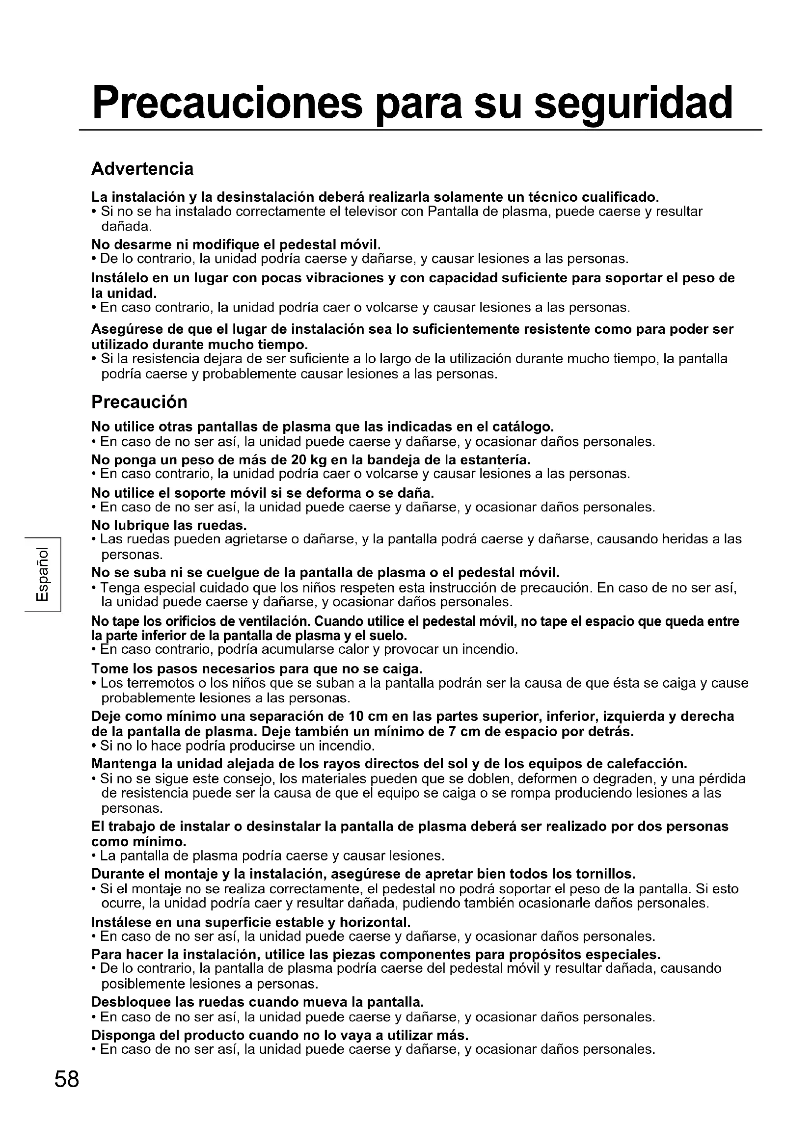 - Las ruedas pueden agrietarse o dañarse, y la pantalla podrá caerse y dañarse, causando heridas a las personas. No se suba ni se cuelgue de la pantalla de plasma o el pedestal móvil.