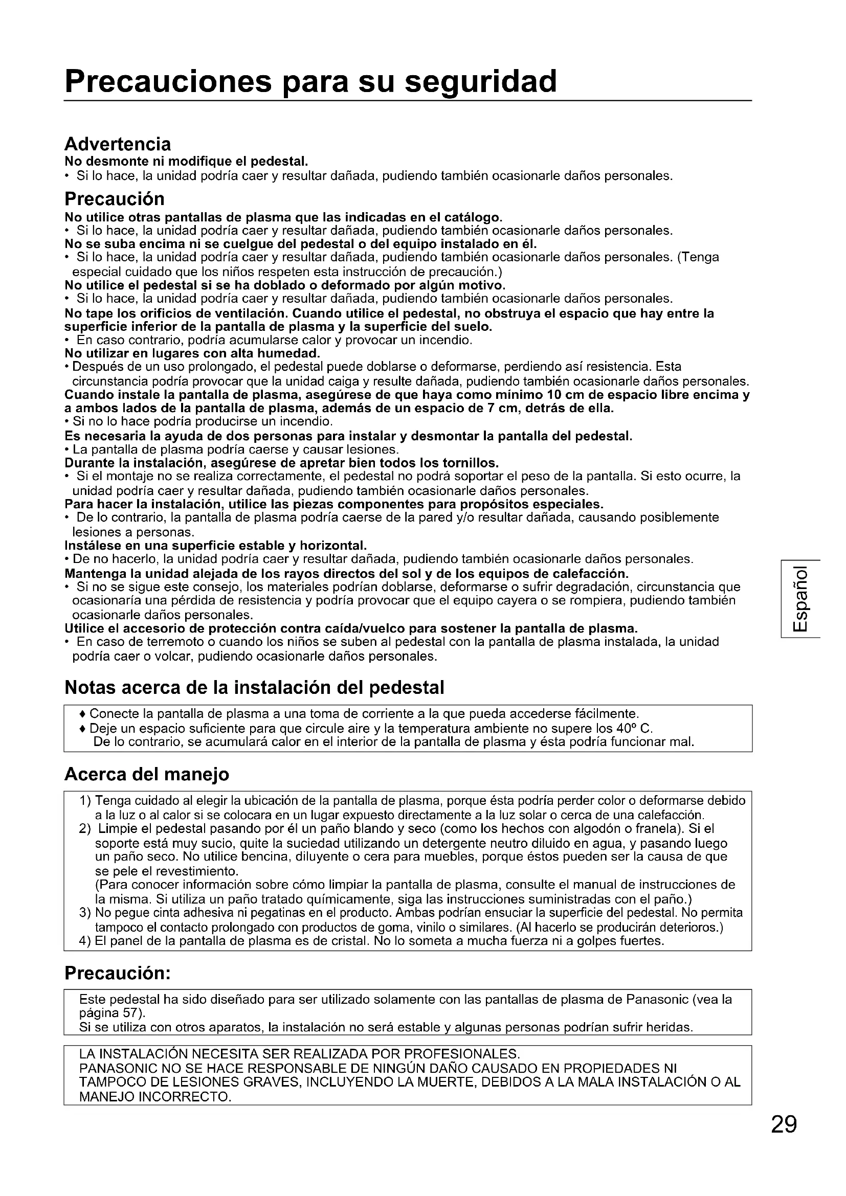 Precaución: Este pedestal ha sido diseñado para ser utilizado solamente con las pantallas de plasma de Panasonic (vea la página 57). Si se utiliza con otros aparatos, la instalación no será estable y algunas personas podrían sufrir heridas. LA INSTALACIÓN NECESITA SER REALIZADA POR PROFESIONALES. PANASONIC NO SE HACE RESPONSABLE DE NINGÚN DAÑO CAUSADO EN PROPIEDADES NI TAMPOCO DE LESIONES GRAVES, INCLUYENDO LA MUERTE, DEBIDOS A LA MALA INSTALACIÓN O AL MANEJO INCORRECTO. Precauciones para su seguridad Español30 Componentes Compruebe que todas las piezas se encuentren presentes en sus cantidades designadas. Base del soporte (1) Abrazadera (1) Poste del soporte (Uno para cada lado, L (izquierda) y R (derecha)) Tornillo de instalación de la unidad (4) Tornillo de instalación de los postes del soporte (4) M5X14 M5X30 Piezas de protección contra caída Procedimiento de montaje