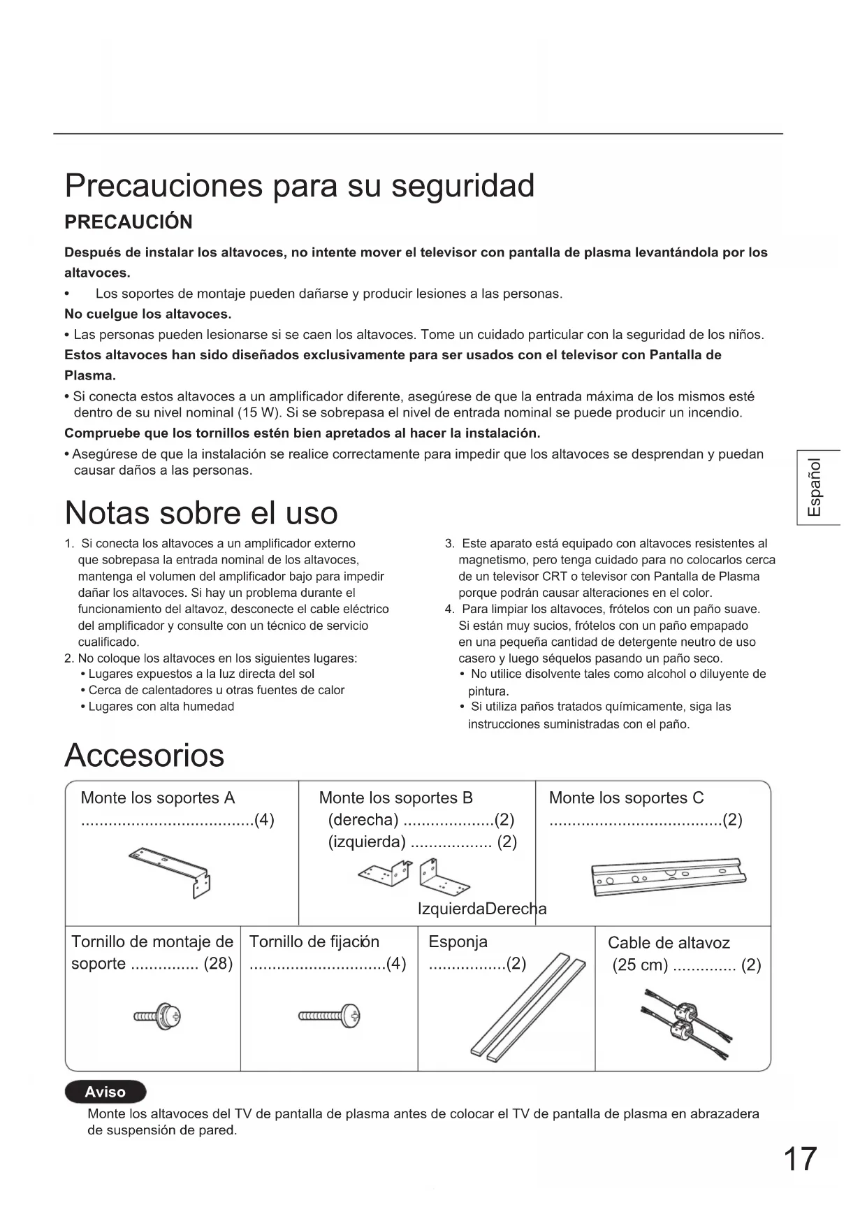 Las personas pueden lesionarse si se caen los altavoces. Tome un cuidado particular con la seguridad de los niños. Estos altavoces han sido diseñados exclusivamente para ser usados con el televisor con Pantalla de Plasma.