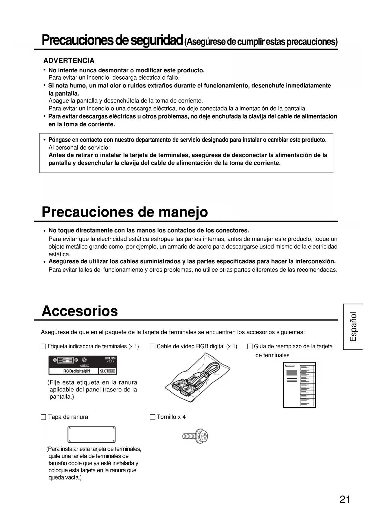 Póngase en contacto con nuestro departamento de servicio designado para instalar o cambiar este producto. Al personal de servicio: Antes de retirar o instalar la tarjeta de terminales, asegúrese de desconectar la alimentación de la pantalla y desenchufar la clavija del cable de alimentación de la toma de corriente. No toque directamente con las manos los contactos de los conectores. Para evitar que la electricidad estática estropee las partes internas, antes de manejar este producto, toque un objeto metálico grande como, por ejemplo, un armario de acero para descargarse usted mismo de la electricidad estática.