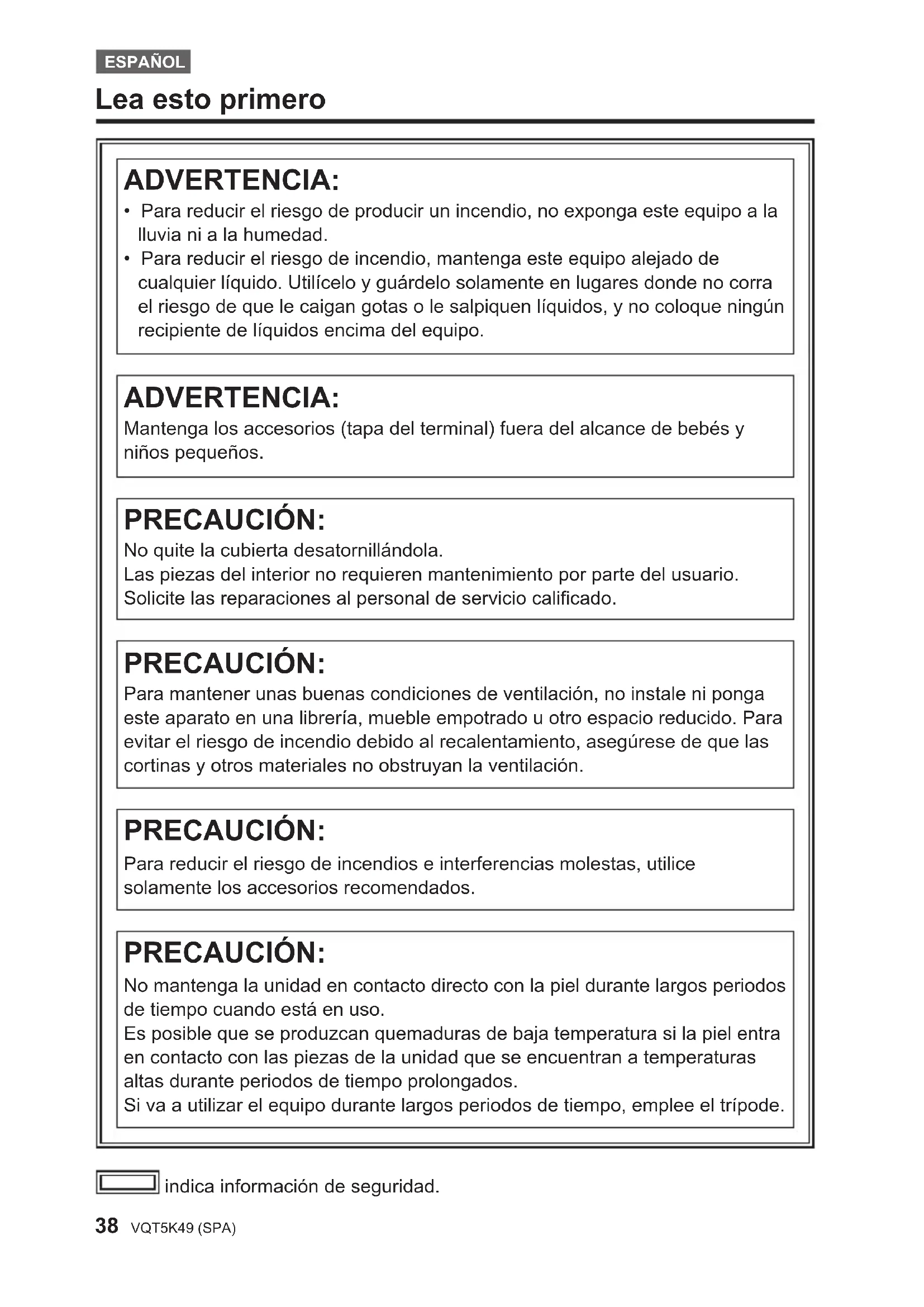 - Para reducir el riesgo de incendio, mantenga este equipo alejado de cualquier liquido. Utilcélo y guardelo solamente en lugares donde no corra el riesgo de que le caigan gotas o le salpiquen liquidos, y no coloque ningún recipiente de liquidos encima del equipo.