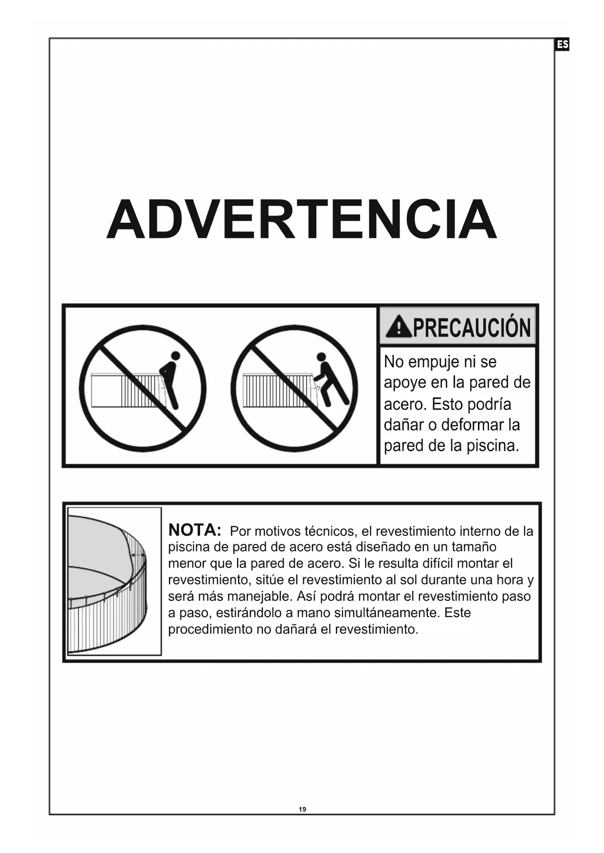 10 cm #04 #0819 No empuje ni se apoye en la pared de acero. Esto podría dañar o deformar la pared de la piscina. NOTA: Por motivos técnicos, el revestimiento interno de la piscina de pared de acero está diseñado en un tamaño menor que la pared de acero. Si le resulta difícil montar el revestimiento, sitúe el revestimiento al sol durante una hora y será más manejable. Así podrá montar el revestimiento paso a paso, estirándolo a mano simultáneamente. Este procedimiento no dañará el revestimiento. ADVERTENCIA PRECAUCIÓN ES20 ¡ADVERTENCIA! RECOMENDAMOS NO DEVOLVEREL PRODUCTO A LA TIENDA¿Dudas? ¿Problemas?¿Faltan piezas?Para FAQ, manuals, videos o piezasde repuesto, por favor visitabestwaycorp.com/support