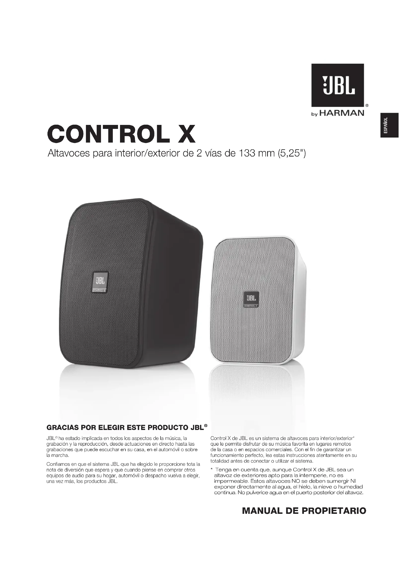 ha estado implicada en todos los aspectos de la música, la grabación y la reproducción, desde actuaciones en directo hasta las grabaciones que puede escuchar en su casa, en el automóvil o sobre la marcha. Conamos en que el sistema JBL que ha elegido le proporcione tota la nota de diversión que espera y que cuando piense en comprar otros equipos de audio para su hogar, automóvil o despacho vuelva a elegir, una vez más, los productos JBL. Control X de JBL es un sistema de altavoces para interior/exterior* que le permite disfrutar de su música favorita en lugares remotos de la casa o en espacios comerciales. Con el n de garantizar un funcionamiento perfecto, lea estas instrucciones atentamente en su totalidad antes de conectar o utilizar el sistema.