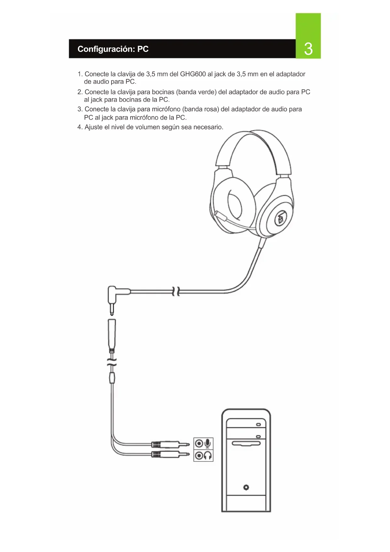 2. Conecte la clavija para bocinas (banda verde) del adaptador de audio para PC
