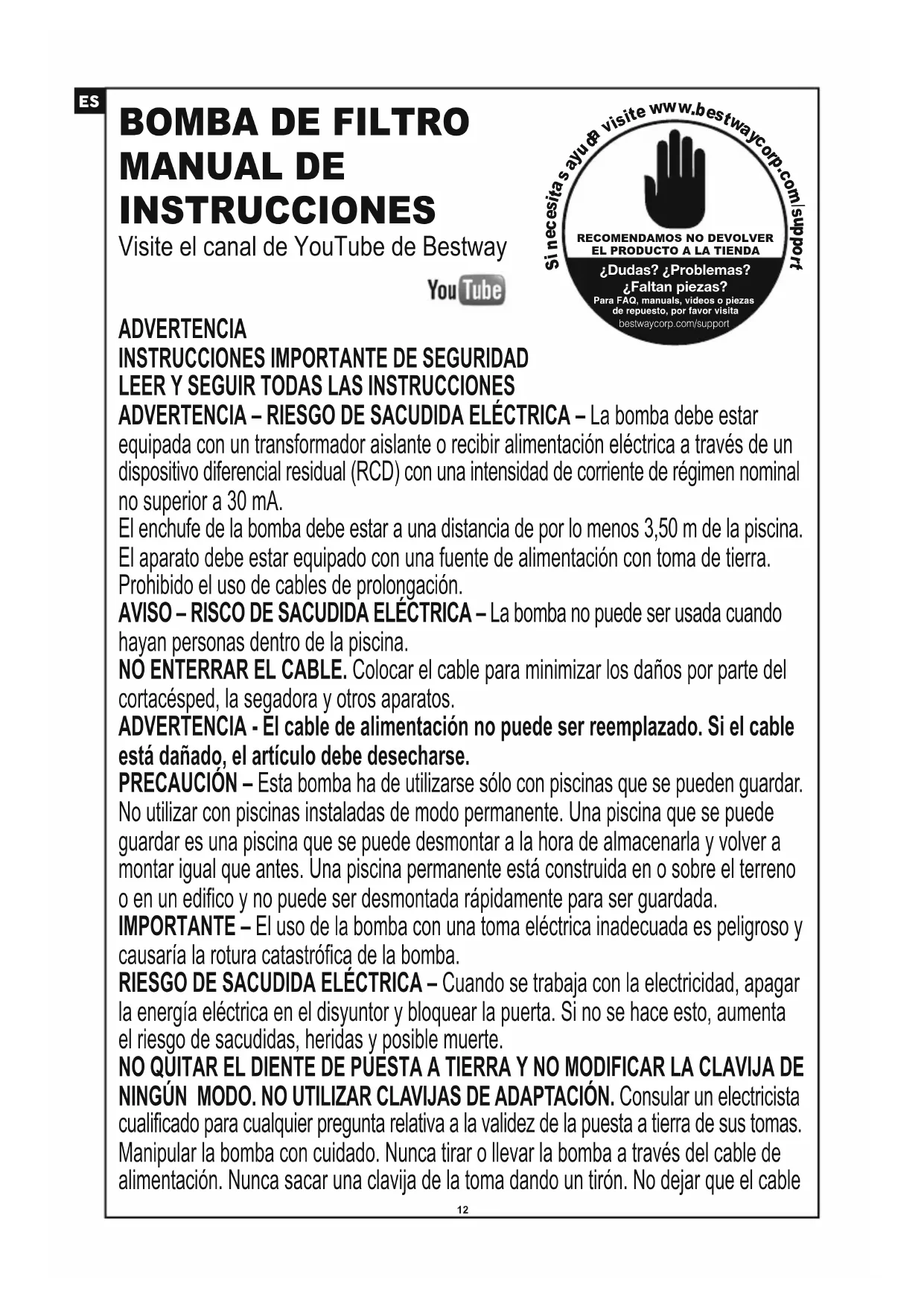 MANUAL DE INSTRUCCIONES Visite el canal de YouTube de Bestway RECOMENDAMOS NO DEVOLVEREL PRODUCTO A LA TIENDA¿Dudas? ¿Problemas?¿Faltan piezas?Para FAQ, manuals, videos o piezasde repuesto, por favor visitabestwaycorp.com/support