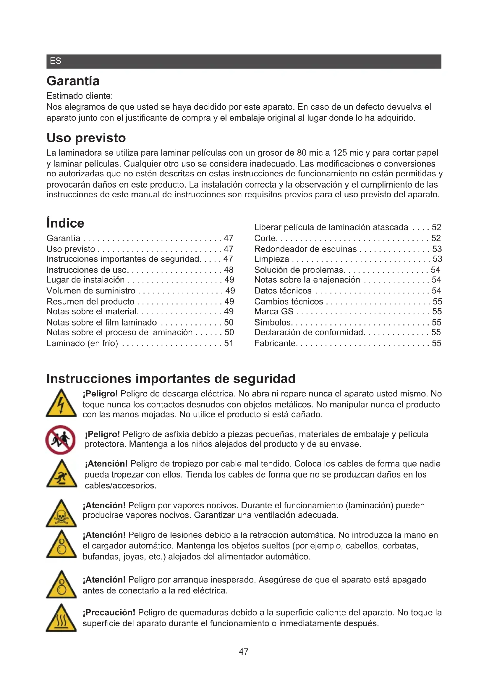 - Garantía Estimado cliente: Nos alegramos de que usted se haya decidido por este aparato. En caso de un defecto devuelva el aparato junto con el justicante de compra y el embalaje original al lugar donde lo ha adquirido. Uso previsto La laminadora se utiliza para laminar películas con un grosor de 80 mic a 125 mic y para cortar papel y laminar películas. Cualquier otro uso se considera inadecuado. Las modicaciones o conversiones no autorizadas que no estén descritas en estas instrucciones de funcionamiento no están permitidas y provocarán daños en este producto. La instalación correcta y la observación y el cumplimiento de las instrucciones de este manual de instrucciones son requisitos previos para el uso previsto del aparato. Índice Garantía p. 47